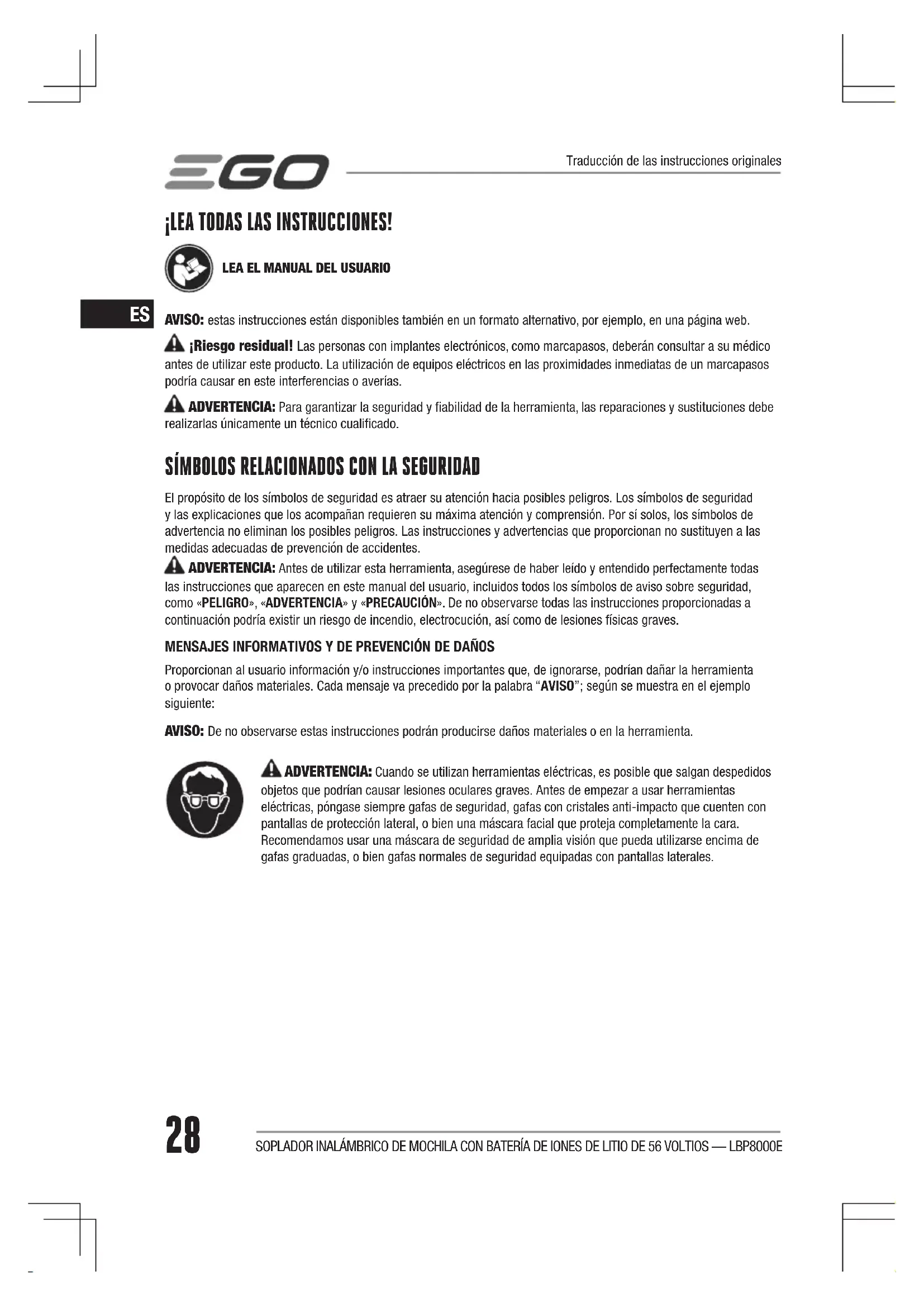 SOPLADOR INALÁMBRICO DE MOCHILA CON BATERÍA DE IONES DE LITIO DE 56 VOLTIOS — LBP8000E ¡LEA TODAS LAS INSTRUCCIONES!