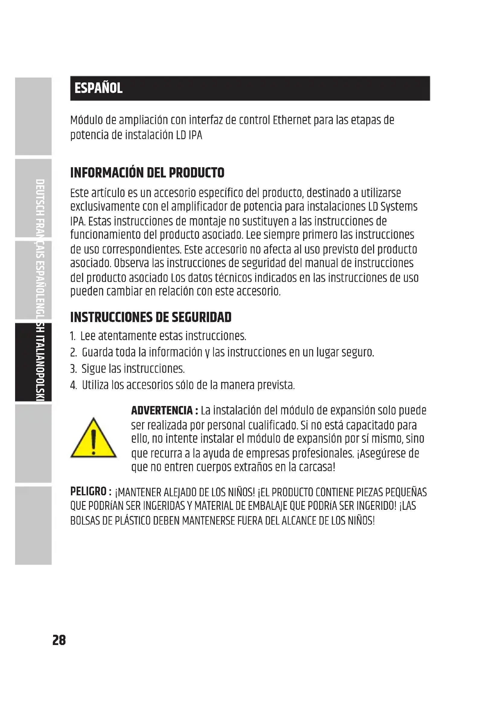 ENGLISH28 ESPAÑOL Módulo de ampliación con interfaz de control Ethernet para las etapas de potencia de instalación LD IPA