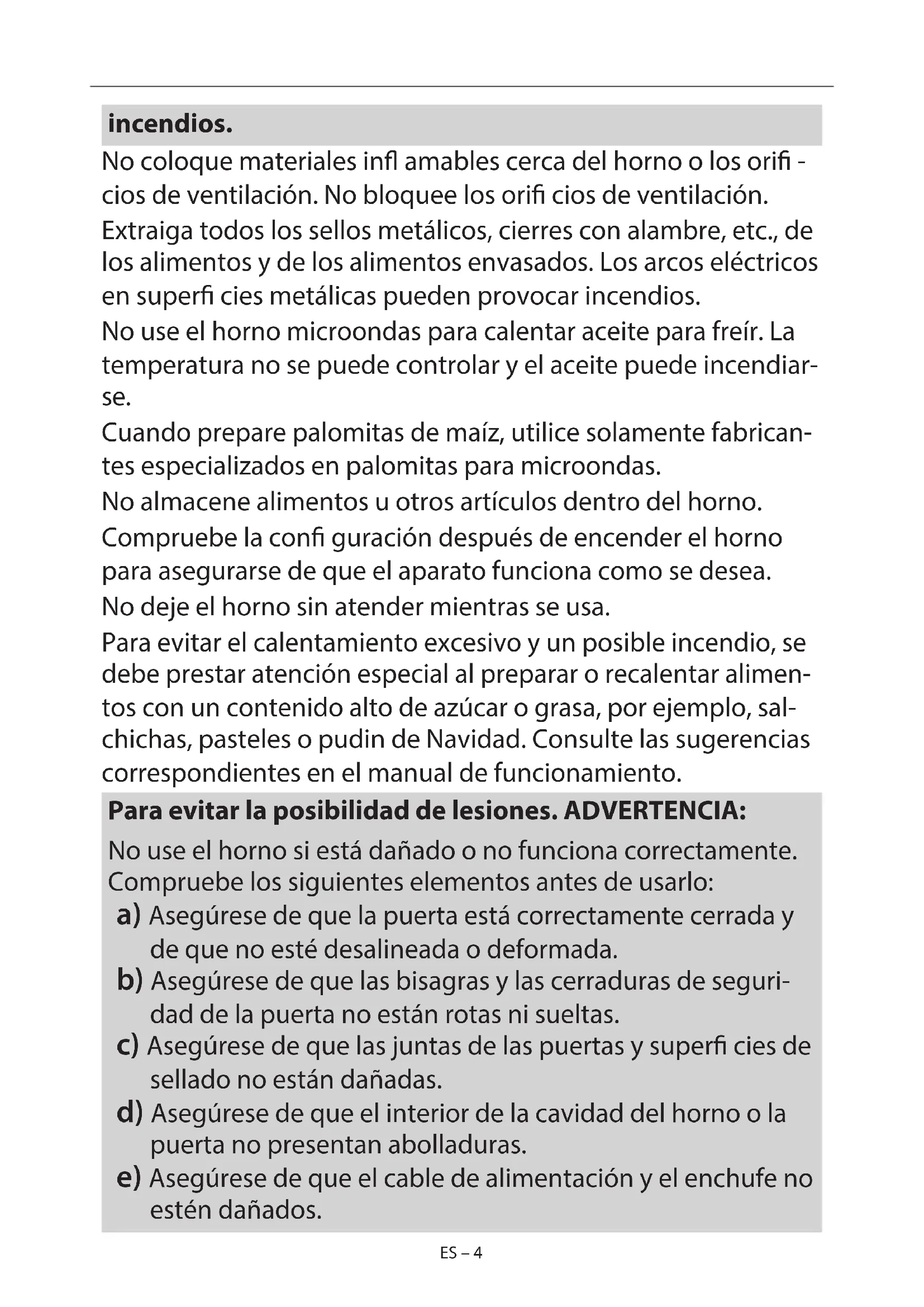 - No sumerja el cable de alimentación ni el enchufe en agua u otros líquidos. ES – 4ES – 4 incendios. No coloque materiales in amables cerca del horno o los ori - cios de ventilación. No bloquee los ori cios de ventilación. Extraiga todos los sellos metálicos, cierres con alambre, etc., de los alimentos y de los alimentos envasados. Los arcos eléctricos en super cies metálicas pueden provocar incendios. No use el horno microondas para calentar aceite para freír. La temperatura no se puede controlar y el aceite puede incendiar- se. Cuando prepare palomitas de maíz, utilice solamente fabrican- tes especializados en palomitas para microondas. No almacene alimentos u otros artículos dentro del horno. Compruebe la con guración después de encender el horno para asegurarse de que el aparato funciona como se desea. No deje el horno sin atender mientras se usa. Para evitar el calentamiento excesivo y un posible incendio, se debe prestar atención especial al preparar o recalentar alimen- tos con un contenido alto de azúcar o grasa, por ejemplo, sal- chichas, pasteles o pudin de Navidad. Consulte las sugerencias correspondientes en el manual de funcionamiento. Para evitar la posibilidad de lesiones. ADVERTENCIA: No use el horno si está dañado o no funciona correctamente. Compruebe los siguientes elementos antes de usarlo: a) Asegúrese de que la puerta está correctamente cerrada y de que no esté desalineada o deformada. b) Asegúrese de que las bisagras y las cerraduras de seguri- dad de la puerta no están rotas ni sueltas. c) Asegúrese de que las juntas de las puertas y super cies de sellado no están dañadas. d) Asegúrese de que el interior de la cavidad del horno o la puerta no presentan abolladuras. e) Asegúrese de que el cable de alimentación y el enchufe no estén dañados.ES – 6 ES – 6