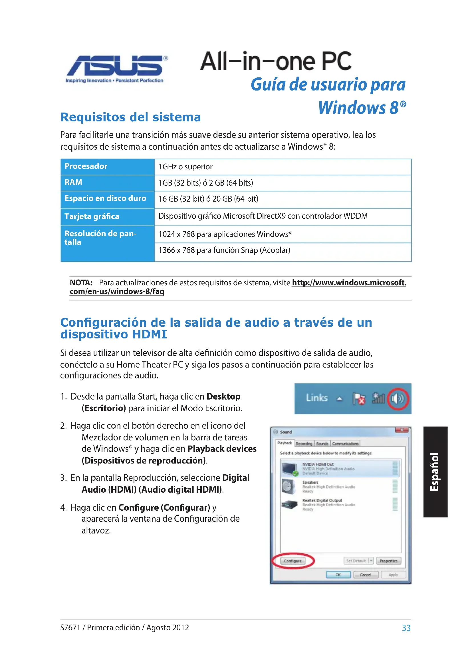 aparecerá la ventana de Conguración de altavoz. NOTA: Para actualizaciones de estos requisitos de sistema, visite http://www.windows.microsoft. com/en-us/windows-8/faq Procesador 1GHz o superior RAM 1GB (32 bits) ó 2 GB (64 bits) Espacio en disco duro 16 GB (32-bit) ó 20 GB (64-bit) Tarjeta gráca Dispositivo gráco Microsoft DirectX9 con controlador WDDM Resolución de pan- talla 1024 x 768 para aplicaciones Windows® 1366 x 768 para función Snap (Acoplar) Requisitos del sistema Para facilitarle una transición más suave desde su anterior sistema operativo, lea los requisitos de sistema a continuación antes de actualizarse a Windows® 8: Español Español S7671 / Primera edición / Agosto 201234 Español Español Español Español