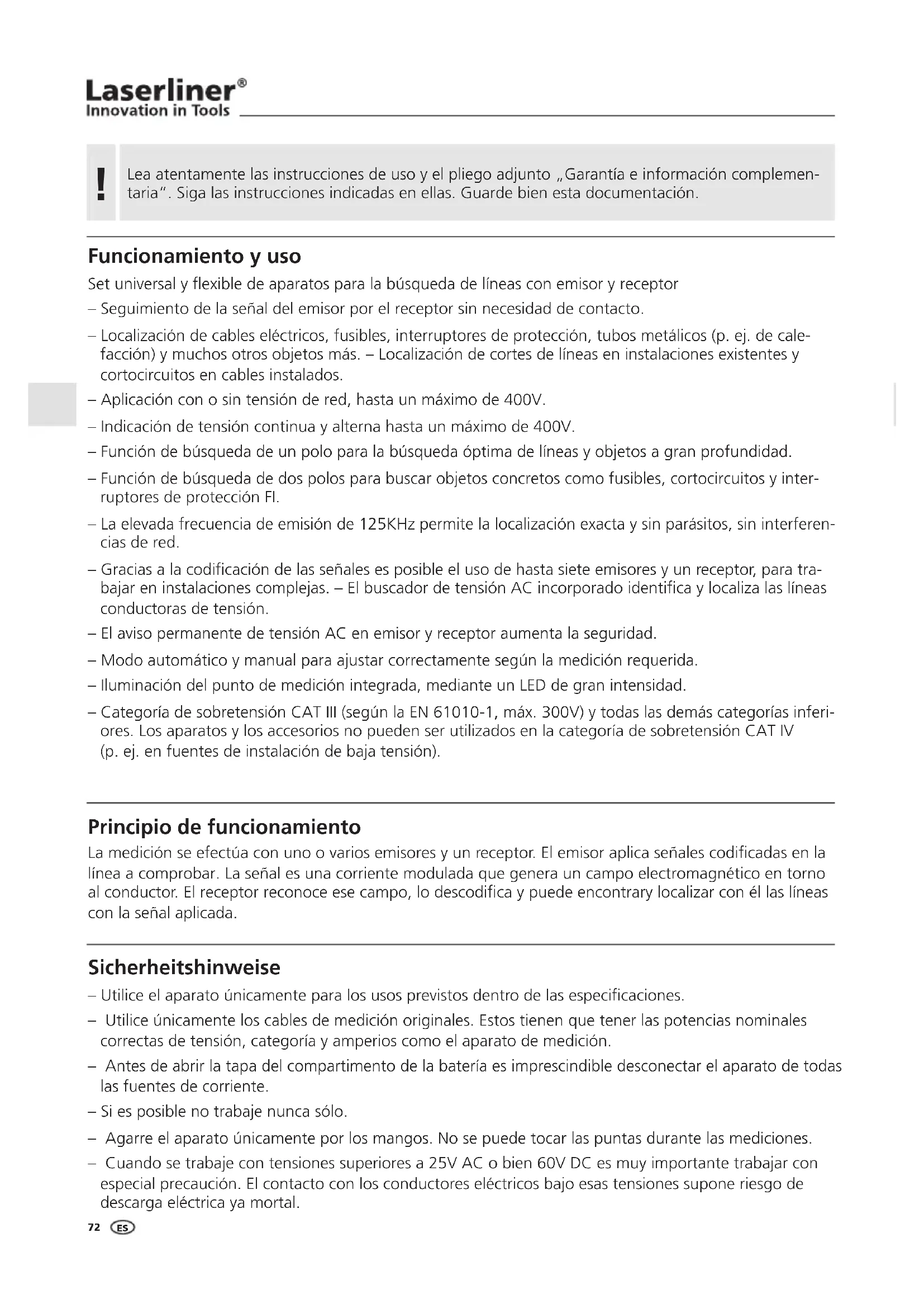 Set universal y × exible de aparatos para la búsqueda de líneas con emisor y receptor – Seguimiento de la señal del emisor por el receptor sin necesidad de contacto. – Localización de cables eléctricos, fusibles, interruptores de protección, tubos metálicos (p. ej. de cale- facción) y muchos otros objetos más. – Localización de cortes de líneas en instalaciones existentes y cortocircuitos en cables instalados. – Aplicación con o sin tensión de red, hasta un máximo de 400V. – Indicación de tensión continua y alterna hasta un máximo de 400V. – Función de búsqueda de un polo para la búsqueda óptima de líneas y objetos a gran profundidad. – Función de búsqueda de dos polos para buscar objetos concretos como fusibles, cortocircuitos y inter- ruptores de protección FI. – La elevada frecuencia de emisión de 125KHz permite la localización exacta y sin parásitos, sin interferen- cias de red. – Gracias a la codiÖ cación de las señales es posible el uso de hasta siete emisores y un receptor, para tra- bajar en instalaciones complejas. – El buscador de tensión AC incorporado identiÖ ca y localiza las líneas conductoras de tensión. – El aviso permanente de tensión AC en emisor y receptor aumenta la seguridad. – Modo automático y manual para ajustar correctamente según la medición requerida. – Iluminación del punto de medición integrada, mediante un LED de gran intensidad. – Categoría de sobretensión CAT III (según la EN 61010-1, máx. 300V) y todas las demás categorías inferi- ores. Los aparatos y los accesorios no pueden ser utilizados en la categoría de sobretensión CAT IV (p. ej. en fuentes de instalación de baja tensión). – Utilice el aparato únicamente para los usos previstos dentro de las especiÖ caciones. – Utilice únicamente los cables de medición originales. Estos tienen que tener las potencias nominales correctas de tensión, categoría y amperios como el aparato de medición. – Antes de abrir la tapa del compartimento de la batería es imprescindible desconectar el aparato de todas las fuentes de corriente. – Si es posible no trabaje nunca sólo. – Agarre el aparato únicamente por los mangos. No se puede tocar las puntas durante las mediciones. – Cuando se trabaje con tensiones superiores a 25V AC o bien 60V DC es muy importante trabajar con especial precaución. El contacto con los conductores eléctricos bajo esas tensiones supone riesgo de descarga eléctrica ya mortal. Funcionamiento y uso Sicherheitshinweise Principio de funcionamiento La medición se efectúa con uno o varios emisores y un receptor. El emisor aplica señales codiÖ cadas en la línea a comprobar. La señal es una corriente modulada que genera un campo electromagnético en torno al conductor. El receptor reconoce ese campo, lo descodiÖ ca y puede encontrary localizar con él las líneas con la señal aplicada.
