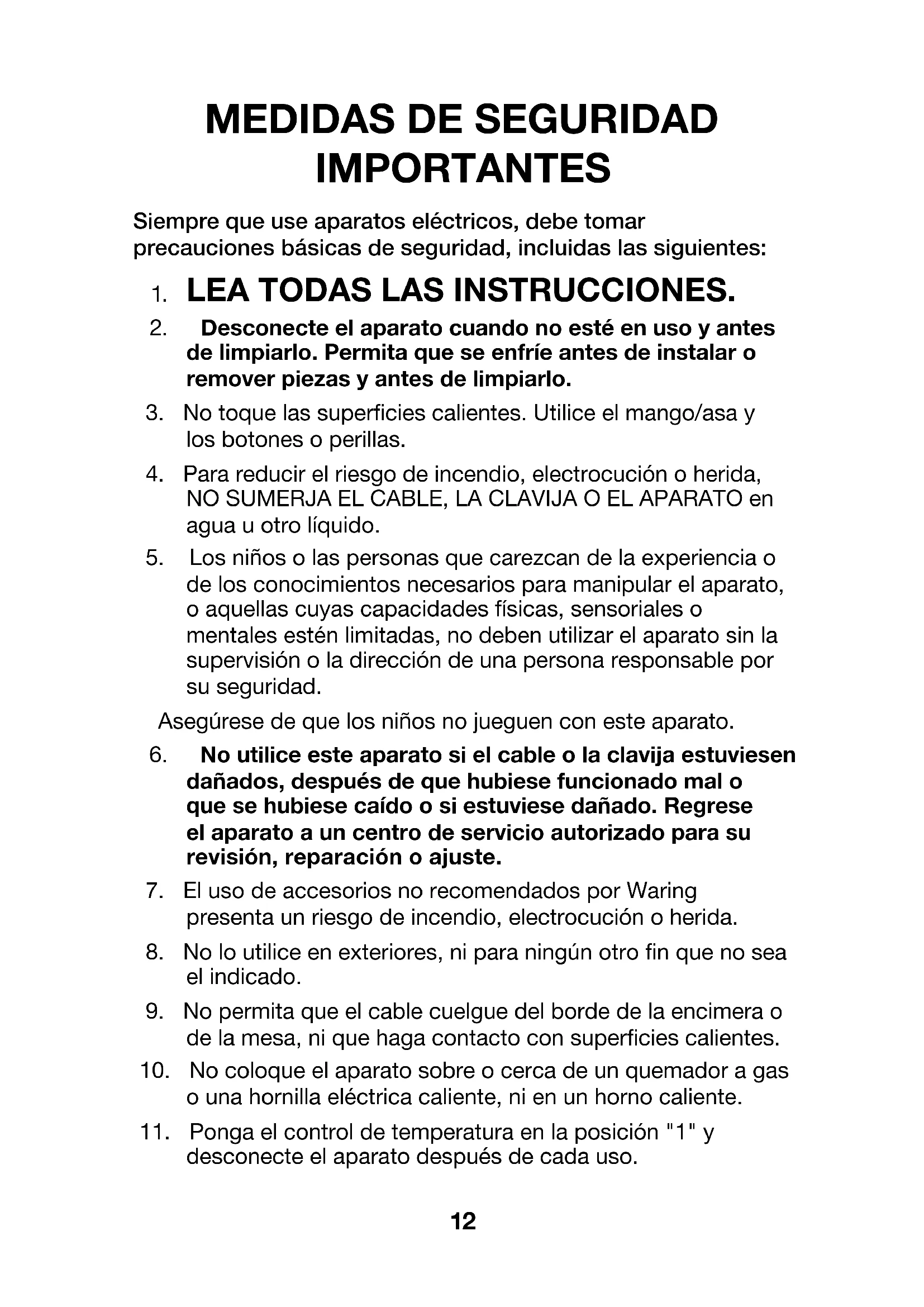 Commercial contra todo defecto de materiales o fabricación durante un año a partir de la fecha de compra, siempre que haya sido usada con alimentos, líquidos no abrasivos (a excepción de detergentes) y semi-líquidos no abrasivos, y que no haya sido sujeta a cargas que excedan su máxima capacidad. Bajo esta garantía, Waring reparará o reemplazará toda pieza que, tras estar inspeccionada por nuestro servicio posventa, demuestre defectos de materiales o fabricación, siempre que el producto se entregue con franqueo pagado a: 314 Ella T. Grasso Ave. Torrington, CT 06790, o a cualquier servicio postventa aprobado. Esta garantía: a) no se aplica a ningún producto desgastado, defectuoso, dañado o roto debido a uso, reparaciones/servicio realizados por personas no autorizadas, o abuso, mal uso, sobrecarga o daños intencionales; b) no cubre daños incidentales o consecuentes de ningún tipo. Advertencia: El utilizar este aparato con corriente continua (C.C.) invalidará la garantía. WARING COMMERCIAL 314 Ella T. Grasso Ave. Torrington, CT 0679022 IMPORTANTES CONSIGNES