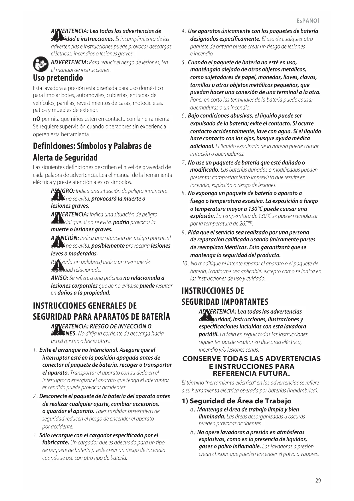 a ) Mantenga el área de trabajo limpia y bien iluminada. Las áreas desorganizadas u oscuras pueden provocar accidentes. b ) No opere lavadoras a presión en atmósferas explosivas, como en la presencia de líquidos, gases o polvo inflamable. Las lavadoras a presión crean chispas que pueden encender el polvo o vapores. 4 . Use aparatos únicamente con los paquetes de batería designados específicamente. El uso de cualquier otro paquete de batería puede crear un riesgo de lesiones eincendio. 5 . Cuando el paquete de batería no esté en uso, manténgalo alejado de otros objetos metálicos, como sujetadores de papel, monedas, llaves, clavos, tornillos u otros objetos metálicos pequeños, que puedan hacer una conexión de una terminal a la otra. Poner en corto las terminales de la batería puede causar quemaduras o un incendio. 6 . Bajo condiciones abusivas, el líquido puede ser expulsado de la batería; evite el contacto. Si ocurre contacto accidentalmente, lave con agua. Si el líquido hace contacto con los ojos, busque ayuda médica adicional. El líquido expulsado de la batería puede causar irritación o quemaduras. 7 . No use un paquete de batería que esté dañado o modificado. Las baterías dañadas o modificadas pueden presentar comportamiento imprevisto que resulte en incendio, explosión o riesgo de lesiones. 8 . No exponga un paquete de batería o aparato a fuego o temperatura excesiva. La exposición a fuego o temperatura mayor a 130°C puede causar una explosión. La temperatura de 130°C se puede reemplazar por la temperatura de 265°F. 9 . Pida que el servicio sea realizado por una persona de reparación calificada usando únicamente partes de reemplazo idénticas. Esto garantizará que se mantenga la seguridad del producto. 10 . No modifique ni intente reparar el aparato o el paquete de batería, (conforme sea aplicable) excepto como se indica en las instrucciones de uso y cuidado.