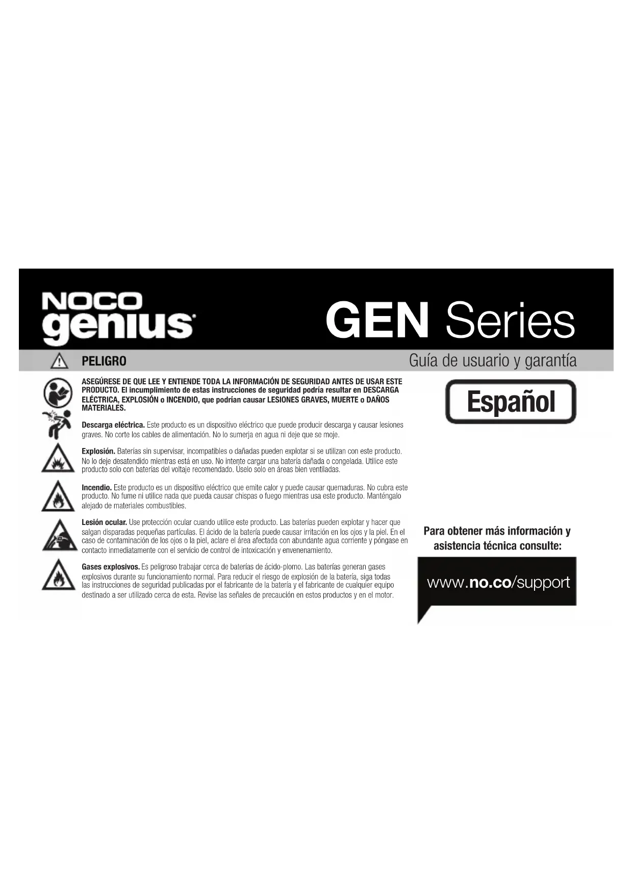Ces conditions s’appliquent uniquement au produit durant la période de garantie. La période écoulée depuis la date d’achat (ou la période écoulée en fonction de la dateFR apparaissant au numéro de série si aucune preuve d’achat n’est fournie) ou les conditions mentionnées précédemment entraînent l’annulation de la garantie sans tracas. Retourner le produit accompagné de la documentation appropriée. Avec reçu : 0 à 3 ans : SANS frais. Avec preuve d’achat, la période de la garantie commence à la date de l’achat. Avec AUCUN reçu : 0 à 3 ans : AUCUNS frais. Avec AUCUNE preuve d’achat, la période la garantie commence à la date du numéro de série. Nous recommandons d’enregistrer votre produit NOCO afin de télécharger la preuve d’achat et de prolonger vos dates de garanties eectives. Vous pouvez enregistrer votre produit NOCO en ligne à : no.co/register. Pour toute question au sujet de votre garantie du produit, contactez le soutien de NOCO (courriel et numéro de téléphone ci-dessus) ou écrivez à : The NOCO Company, 30339 Diamond Parkway, #102, Glenwillow, OH 44139 USA.Guía de usuario y garantía PELIGRO ASEGÚRESE DE QUE LEE Y ENTIENDE TODA LA INFORMACIÓN DE SEGURIDAD ANTES DE USAR ESTE PRODUCTO. El incumplimiento de estas instrucciones de seguridad podría resultar en DESCARGA ELÉCTRICA, EXPLOSIÓN o INCENDIO, que podrían causar LESIONES GRAVES, MUERTE o DAÑOS MATERIALES. Descarga eléctrica. Este producto es un dispositivo eléctrico que puede producir descarga y causar lesiones graves. No corte los cables de alimentación. No lo sumerja en agua ni deje que se moje. Explosión. Baterías sin supervisar, incompatibles o dañadas pueden explotar si se utilizan con este producto. No lo deje desatendido mientras está en uso. No intente cargar una batería dañada o congelada. Utilice este producto solo con baterías del voltaje recomendado. Úselo solo en áreas bien ventiladas. Incendio. Este producto es un dispositivo eléctrico que emite calor y puede causar quemaduras. No cubra este producto. No fume ni utilice nada que pueda causar chispas o fuego mientras usa este producto. Manténgalo alejado de materiales combustibles. Lesión ocular. Use protección ocular cuando utilice este producto. Las baterías pueden explotar y hacer que salgan disparadas pequeñas partículas. El ácido de la batería puede causar irritación en los ojos y la piel. En el caso de contaminación de los ojos o la piel, aclare el área afectada con abundante agua corriente y póngase en contacto inmediatamente con el servicio de control de intoxicación y envenenamiento. Gases explosivos. Es peligroso trabajar cerca de baterías de ácido-plomo. Las baterías generan gases explosivos durante su funcionamiento normal. Para reducir el riesgo de explosión de la batería, siga todas las instrucciones de seguridad publicadas por el fabricante de la batería y el fabricante de cualquier equipo destinado a ser utilizado cerca de esta. Revise las señales de precaución en estos productos y en el motor. GEN Series Para obtener más información y asistencia técnica consulte: www.no.co/support EspañolES Acerca de GEN Series. El NOCO GEN Series cargador de batería integrado representa algunas de las tecnologías más innovadoras y avanzadas del mercado, lo que hace que cada carga sea simple y fácil. Es posiblemente el cargador más seguro y eficiente que jamás utilizará. La serie GEN cargador de batería integrado está diseñada para cargar todo tipo de baterías de plomo y ácido de 12 V, incluidas las húmedas (de inmersión), de gel, MF (sin mantenimiento), de CA (calcio), EFB (batería de inmersión mejorada) y AGM (alfombrilla de absorción de vidrio), además de las baterías de litio de 12 V (LiFePO4). Es adecuada para cargar capacidades de batería de hasta 120 amperios-hora y para mantener todos los tamaños de batería. Empezando. Antes de usar el cargador, lea detenidamente las precauciones específicas del fabricante de la batería y las tasas de carga recomendadas para la batería. Asegúrese de determinar el voltaje y la química de la batería consultando el manual del propietario de la batería antes de cargarla. Montaje. Es importante tener en cuenta la distancia a la batería. La longitud del cable de CC desde el cargador, ya sea con la abrazadera de la batería o los conectores del terminal de ojal, es de aproximadamente 72 pulgadas (182.88 cm). Deje una holgura de 12 pulgadas (30.4 cm) entre las conexiones. Proposición 65. ADVERTENCIA: Este producto puede exponerle a químicos incluyendo plomo y gases de escape, que son conocido s por el Estado de California como causante (s) de cáncer y defectos de nacimiento u otros daños reproductivos. Para mayor información, visite www.P65Warnings.ca.gov. Precaución. Utilice este producto solo para el propósito para el que fue diseñado. Debería haber una persona lo suficientemente cerca como para oír su voz o acudir en su ayuda en caso de emergencia. Ponga agua limpia y jabón a su alcance por si tuviera que usarlos en caso de contaminación con el ácido de la batería. Use protección ocular completa y ropa protectora cuando trabaje cerca de una batería. Lávese siempre las manos después de manipular baterías y materiales relacionados. No use objetos metálicos cuando trabaje con baterías, incluidas herramientas, relojes o joyas. Si cae metal sobre la batería, pueden saltar chispas o producirse un cortocircuito que podría provocar descarga eléctrica, incendio, explosión y causar lesiones, muerte o daños materiales. Menores de edad. Si el Comprador ha adquirido este producto para que lo use un menor de edad, el adulto que lo ha comprado se compromete a proporcionar instrucciones y advertencias detalladas al menor de edad antes de que este lo use. De no hacerlo, la responsabilidad recaerá únicamente sobre el Comprador, que se compromete a indemnizar a NOCO por el uso no intencionado o