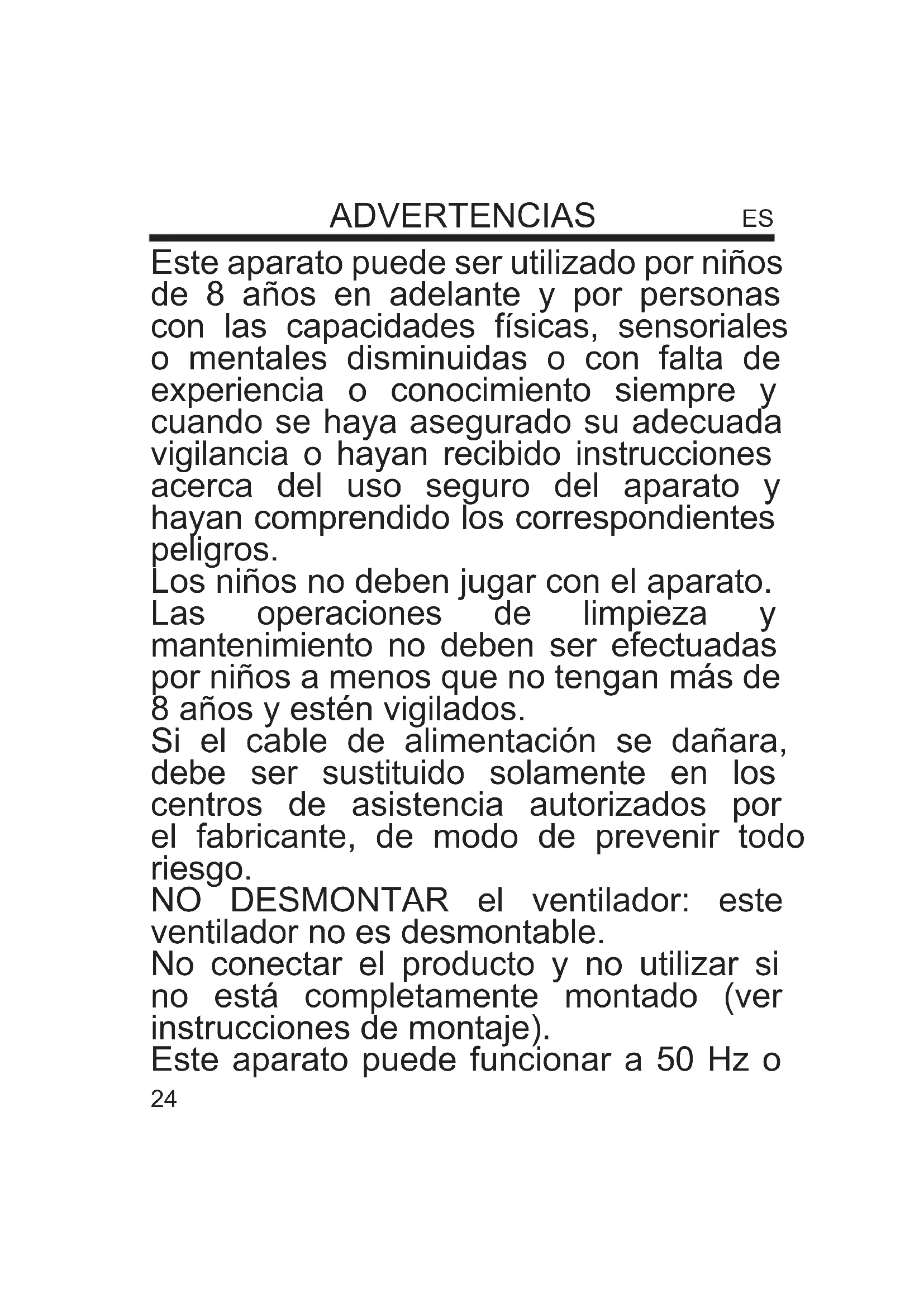 “Umsetzung der Richtlinie 2012/19/EU über Elektro- und Elektronik-Altgeräte (WEEE)” zur Verringerung der Verwendung gefährlicher Stoe in Elektro- und Elektronikgeräten sowie zur Abfallentsorgung. Das Symbol der durchgestrichenen Mülltonne auf dem Gerät oder seiner Verpackung weist darauf hin, dass das Produkt am Ende seiner Lebensdauer getrennt von anderen Abfällen entsorgt werden muss. Der Benutzer muss daher die ausgemusterten Geräte zu geeigneten getrennten Sammelstellen für Elektro- und Elektronikabfälle bringen. Für weitere Einzelheiten wenden Sie sich bitte an die zuständige lokale Behörde. Eine geeignete getrennte Sammlung der Geräte für das spätere Recycling, die Verarbeitung oder die umweltfreundliche Entsorgung trägt dazu bei, Schäden an der Umwelt und der menschlichen Gesundheit zu vermeiden, und fördert die Wiederverwendung und/ oder das Recycling der Materialien, aus denen die Geräte bestehen. Eine widerrechtliche Entsorgung des Produkts durch den Benutzer hat die Anwendung von Verwaltungsstrafen gemäß den geltenden Gesetzen zur Folge. BENUTZERINFORMATIONEN VERPACKUNG Um die Umwelt zu schonen, muss das Verpackungsmaterial ordnungsgemäß in einer getrennten Sammlung entsorgt werden. Prüfen Sie die örtlichen Vorschriften.23 GARANTIESCHEIN Garantiebedingungen: Die Garantie dauert 24 Monate vom Einkaufsdatum. Dieser Garantieschein hat nur Gültigkeit, wenn er ordnungsgemäß ausgefüllt und zusammen mit dem Kassenzettel vorgelegt wird. Die Garantie umfaßt den Ersatz oder die Reparatur aller Komponenten des Gerätes im Falle von Herstellungsfehlern. Das Gerät wird ausschließlich nur von einem unserer autorisierten Kundendienststellen zurückgenommen. Außerdem garantieren wir für fachgerechte Dienstleistung (gegen Bezahlung) auch außerhalb der Garantiezeit. Die Herstellungsrma lehnt jede Verantwortung hinsichtlich Schäden an Personen, Tieren oder Gegenständen ab, die durch unsachgemäße Benutzung des Geräts oder Nichtbefolgen der beiliegenden Bedienungs- anleitung entstehen. Einschränkungen: Der Garantieanspruch bzw. unsere Verantwortlichkeit erlischt, wenn das Gerät: - von nicht autorisierten Personen demontiert wurde; - in unsachgemäßer oder unnormaler Weise zum Einsatz kam, aufbewahrt oder transportiert wurde. Weiterhin sind von der Garantie alle äußeren Abnutzungserscheinungen am Gerät, die die Funktion des Gerätes nicht beeinträchtigen, ausgeschlossen. Sollten, trotz der Sorgfalt bei der Auswahl der Materialien und trotz der Bemühungen bei der Realisierung des Produktes, das Sie erst gerade erworben haben, Defekte gefunden werden oder sollten Sie irgendwelche Informationen benötigen, so empfehlen wir Ihnen, sich an den für Ihr Gebiet zuständigen Fachhändler zu wenden.24 Este aparato puede ser utilizado por niños de 8 años en adelante y por personas con las capacidades físicas, sensoriales o mentales disminuidas o con falta de experiencia o conocimiento siempre y cuando se haya asegurado su adecuada vigilancia o hayan recibido instrucciones acerca del uso seguro del aparato y hayan comprendido los correspondientes peligros. Los niños no deben jugar con el aparato. Las operaciones de limpieza y mantenimiento no deben ser efectuadas por niños a menos que no tengan más de 8 años y estén vigilados. Si el cable de alimentación se dañara, debe ser sustituido solamente en los centros de asistencia autorizados por el fabricante, de modo de prevenir todo riesgo. NO DESMONTAR el ventilador: este ventilador no es desmontable. No conectar el producto y no utilizar si no está completamente montado (ver instrucciones de montaje). Este aparato puede funcionar a 50 Hz o ADVERTENCIAS ES25 ATENCIÓN: leer atentamente el presente manual ya que contiene instrucciones importantes para la seguridad durante la instalación, uso y mantenimiento. Instrucciones importantes de conservar para futuras referencias. Los niños NO deben jugar con el dispositivo. Este aparato deberá estar destinado solo al uso para el cual ha sido expresamente creado; cualquier empleo no conforme con las indicaciones contenidas en el presente manual es de considerar inadecuado y peligroso. El fabricante no puede ser considerado responsable por eventuales daños derivados por un uso inadecuado e/o irracional. Este aparato NO es idóneo para empleo en ambientes con atmósferas explosivas (con presencia de sustancias inamables en forma de gas, vapor, neblina o polvo, en condiciones atmosféricas donde, después del encendido, la combustión se propaga en el aire). Los elementos del embalaje (bolsas de plástico, poliestireno expandido, etc.) no deben ser dejados al alcance de niños o personas con capacidades reducidas ya que representan potenciales fuentes de peligro. La/el instalación/ensamblaje del dispositivo deberá ser efectuada/o según las prescripciones del fabricante. Un procedimiento errado puede causar daños a personas, animales o cosas, de los cuales el fabricante no puede ser considerado responsable. Colocar y utilizar el aparato en un nivel de apoyo horizontal y estable. Antes de utilizar el aparato vericar visualmente la integridad del mismo y de su cable de alimentación. En caso de dudas dirigirse a personal cualicado. Antes de alimentar el aparato asegurarse de que sus datos de placa (tensión y frecuencia) correspondan con los de la red de distribución eléctrica y que la toma sea adecuada al terminal del cable del cual que está dotado el aparato. Vericar que la instalación eléctrica utilizada para la alimentación esté dotada de las protecciones adecuadas de acuerdo con las leyes vigentes. NO alimentar el aparato mediante tomas múltiples. Evitar si es posible el empleo de adaptadores y/o alargadores; en caso de que su empleo fuera necesario utilizar exclusivamente material conforme con las normas vigentes de seguridad y en el respeto de los parámetros eléctricos de los adaptadores en cuestión. El aparato no debe ser encendido mediant