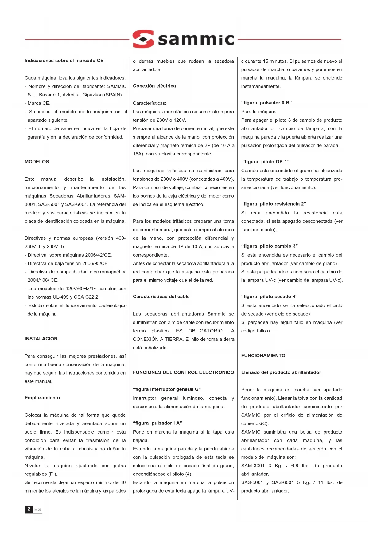 MODE D’EMPLOI - INSTRUZIONI PER L’USO - MANUAL DE INSTRUÇÕES SAM-3001 SAS-5001 SAS-6001 Secadoras-abrillantadoras de cubiertos Cutlery dryers-polishers Bestecktrockner- Pliermaschine Polisseurs à couverts Asciugatrici-brillantatrici di posate Secadores-polidores de talheresIndicaciones sobre el marcado CE Cada máquina lleva los siguientes indicadores: - Nombre y dirección del fabricante: SAMMIC S.L., Basarte 1, Azkoitia, Gipuzkoa (SPAIN). - Marca CE. - Se indica el modelo de la máquina en el apartado siguiente. - El número de serie se indica en la hoja de garantía y en la declaración de conformidad. MODELOS Este manual describe la instalación, funcionamiento y mantenimiento de las máquinas Secadoras Abrillantadoras SAM- 3001, SAS-5001 y SAS-6001. La referencia del modelo y sus características se indican en la placa de identificación colocada en la máquina. Directivas y normas europeas (versión 400- 230V III y 230V II): - Directiva sobre máquinas 2006/42/CE. - Directiva de baja tensión 2006/95/CE. - Directiva de compatibilidad electromagnética 2004/108/ CE. - Los modelos de 120V/60Hz/1~ cumplen con las normas UL-499 y CSA C22.2. - Estudio sobre el funcionamiento bacteriológico de la máquina. INSTALACIÓN Para conseguir las mejores prestaciones, así como una buena conservación de la máquina, hay que seguir las instrucciones contenidas en este manual. Emplazamiento Colocar la máquina de tal forma que quede debidamente nivelada y asentada sobre un suelo firme. Es indispensable cumplir esta condición para evitar la trasmisión de la vibración de la cuba al chasis y no dañar la máquina. Nivelar la máquina ajustando sus patas regulables (F ). Se recomienda dejar un espacio mínimo de 40 mm entre los laterales de la máquina y las paredes o demás muebles que rodean la secadora abrillantadora. Conexión eléctrica Características: Las máquinas monofásicas se suministran para tensión de 230V o 120V. Preparar una toma de corriente mural, que este siempre al alcance de la mano, con protección diferencial y magneto térmica de 2P (de 10 A a 16A), con su clavija correspondiente. Las máquinas trifásicas se suministran para tensiones de 230V o 400V (conectadas a 400V). Para cambiar de voltaje, cambiar conexiones en los bornes de la caja eléctrica y del motor como se indica en el esquema eléctrico. Para los modelos trifásicos preparar una toma de corriente mural, que este siempre al alcance de la mano, con protección diferencial y magneto térmica de 4P de 10 A, con su clavija correspondiente. Antes de conectar la secadora abrillantadora a la red comprobar que la máquina esta preparada para el mismo voltaje que el de la red. Características del cable Las secadoras abrillantadoras Sammic se suministran con 2 m de cable con recubrimiento termo plástico. ES OBLIGATORIO LA CONEXIÓN A TIERRA. El hilo de toma a tierra está señalizado.