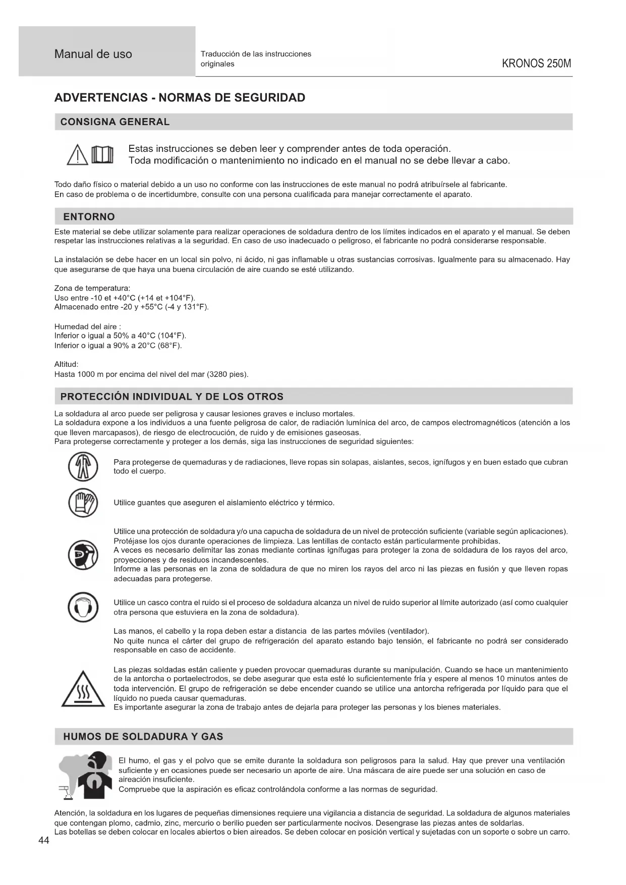 Manual de uso KRONOS 250M Traducción de las instrucciones originales La soldadura no se debe efectuar cerca de grasa o de pintura. RIESGO DE FUEGO Y DE EXPLOSIÓN Proteja completamente la zona de soldadura, los materiales inamables deben alejarse al menos 11 metros. Cerca de la zona de operaciones de soldadura debe haber un anti-incendios. Atención a las proyecciones de materiales calientes o chispas incluso a través de las suras. Pueden generar un incendio o una explosión. Aleje las personas, objetos inamables y contenedores a presión a una distancia de seguridad suciente. La soldadura en contenedores o tubos cerrados está prohibida y en caso de que estén abiertos se les debe vaciar de cualquier material inamable o explosivo (aceite, carburante, residuos de gas...). Las operaciones de pulido no se deben dirigir hacia la fuente de energía de soldadura o hacia materiales inamables.