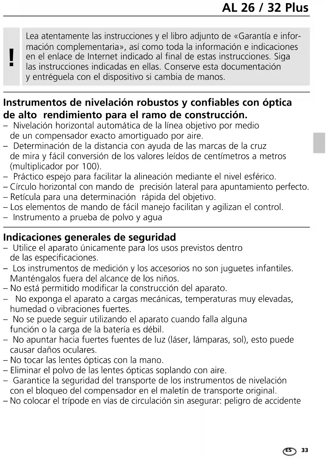 Círculo horizontal con mando de precisión lateral para apuntamiento perfecto. – Retícula para una determinación rápida del objetivo. – Los elementos de mando de fácil manejo facilitan y agilizan el control. – Instrumento a prueba de polvo y agua Lea atentamente las instrucciones y el libro adjunto de «Garantía e infor- mación complementaria», así como toda la información e indicaciones en el enlace de Internet indicado al final de estas instrucciones. Siga las instrucciones indicadas en ellas. Conserve esta documentación y entréguela con el dispositivo si cambia de manos.