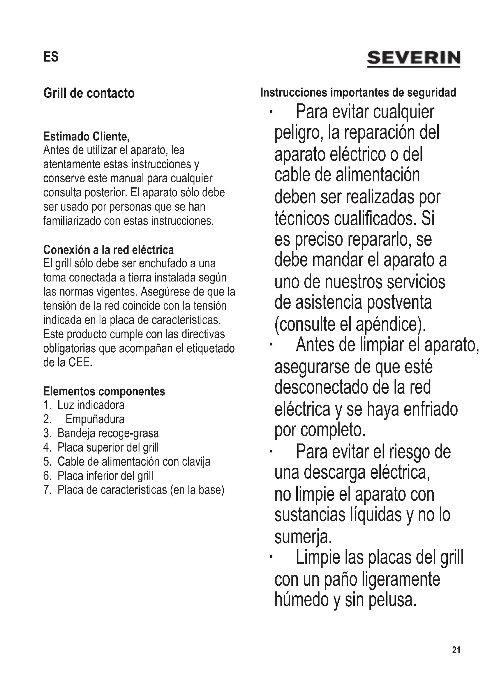 Grill de contacto Estimado Cliente, Antes de utilizar el aparato, lea atentamente estas instrucciones y conserve este manual para cualquier consulta posterior. El aparato sólo debe ser usado por personas que se han familiarizado con estas instrucciones. Conexión a la red eléctrica El grill sólo debe ser enchufado a una toma conectada a tierra instalada según las normas vigentes. Asegúrese de que la tensión de la red coincide con la tensión indicada en la placa de características. Este producto cumple con las directivas obligatorias que acompañan el etiquetado de la CEE. Elementos componentes