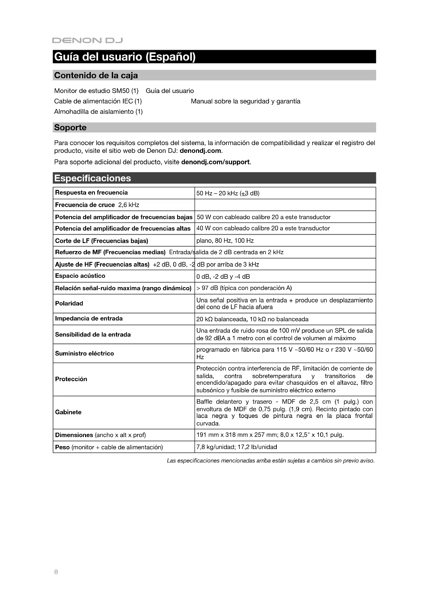 Guía del usuario (Español) Contenido de la caja Monitor de estudio SM50 (1) Guía del usuario Cable de alimentación IEC (1) Manual sobre la seguridad y garantía Almohadilla de aislamiento (1) Soporte Para conocer los requisitos completos del sistema, la información de compatibilidad y realizar el registro del producto, visite el sitio web de Denon DJ: denondj.com. Para soporte adicional del producto, visite denondj.com/support. Especificaciones Respuesta en frecuencia 50 Hz – 20 kHz (+3 dB) Frecuencia de cruce 2,6 kHz Potencia del amplificador de frecuencias bajas 50 W con cableado calibre 20 a este transductor Potencia del amplificador de frecuencias altas 40 W con cableado calibre 20 a este transductor Corte de LF (Frecuencias bajas) plano, 80 Hz, 100 Hz Refuerzo de MF (Frecuencias medias) Entrada/salida de 2 dB centrada en 2 kHz Ajuste de HF (Frecuencias altas) +2 dB, 0 dB, -2 dB por arriba de 3 kHz Espacio acústico 0 dB, -2 dB y -4 dB Relación señal-ruido maxima (rango dinámico)> 97 dB (típica con ponderación A) Polaridad Una señal positiva en la entrada + produce un desplazamiento del cono de LF hacia afuera Impedancia de entrada 20 kΩ balanceada, 10 kΩ no balanceada Sensibilidad de la entrada Una entrada de ruido rosa de 100 mV produce un SPL de salida de 92 dBA a 1 metro con el control de volumen al máximo Suministro eléctrico programado en fábrica para 115 V ~50/60 Hz o r 230 V ~50/60 Protección Protección contra interferencia de RF, limitación de corriente de salida, contra sobretemperatura y transitorios de encendido/apagado para evitar chasquidos en el altavoz, filtro subsónico y fusible de suministro eléctrico externo Gabinete Baffle delantero y trasero - MDF de 2,5 cm (1 pulg.) con envoltura de MDF de 0,75 pulg. (1,9 cm). Recinto pintado con laca negra y toques de pintura negra en la placa frontal curvada. Dimensiones (ancho x alt x prof) 191 mm x 318 mm x 257 mm; 8,0 x 12,5" x 10,1 pulg. Peso (monitor + cable de alimentación) 7,8 kg/unidad; 17,2 lb/unidad Las especificaciones mencionadas arriba están sujetas a cambios sin previo aviso.9