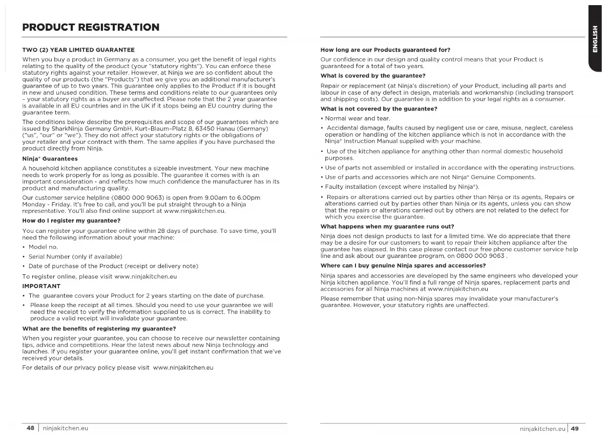 GARANTÍA LIMITADA DE DOS (2) AÑOS Cuando adquiere un producto en España en calidad de consumidor, a usted le amparan derechos legales en lo que respecta a la calidad de dicho producto. Usted puede hacer valer esos derechos legales ante su proveedor. No obstante, Ninja confía tanto en la calidad de sus productos (los “Productos”) que le otorgamos una garantía adicional del fabricante de hasta dos años. Esta garantía solo resulta de aplicación a los Productos en el caso de que estos hayan sido comprados nuevos y sin ningún tipo de uso. Estos términos y condiciones se aplican solamente a nuestras garantías, sin que sus derechos legales como comprador se vean afectados. Tenga en cuenta que los dos años de garantía están disponibles en todos los países de la UE y en el Reino Unido en el supuesto que dejase de pertenecer a la UE durante el periodo de garantía. A continuación, se detallan los requisitos previos y el alcance de nuestra garantía, los cuales son emitidos por SharkNinja Germany GmbH, empresa con domicilio social en Kurt–Blaum–Platz 8, 63450 Hanau (Alemania) (“nos”, “nuestro[s]”, “nuestra[s]” o “nosotros”). Dichas condiciones no afectan a sus derechos legales, a las obligaciones de su proveedor ni a los acuerdos que usted haya estipulado con él. Lo anteriormente mencionado resulta igualmente de aplicación en el caso de que usted haya comprado el producto a Ninja de forma directa. Garantías de Ninja® Un electrodoméstico de cocina constituye una inversión considerable. El nuevo aparato debe funcionar correctamente el mayor tiempo posible. La garantía que lo acompaña es un compromiso importante y refleja el grado de confianza del fabricante en la calidad de sus productos. Puede encontrar asistencia en línea en www.ninjakitchen.eu. ¿Cómo debo registrar mi garantía? Puede registrar su garantía en línea en un plazo de 28 días a partir de la fecha de compra. Para ahorrar tiempo, le informamos de que necesitará los siguientes datos de su máquina: