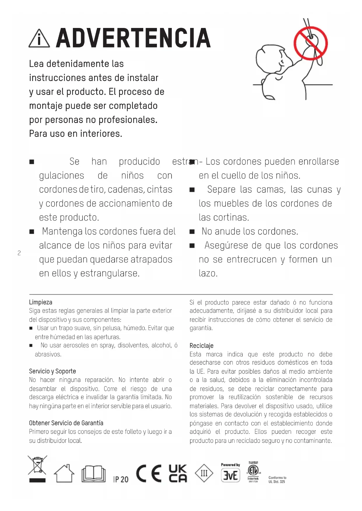 NEDERLANDSGuía de configuración Cortina Enrollable Motor CM-03-E/CM-05-E/CM-45-E ES2 Con forms to UL Std. 325 Limpieza Siga estas reglas generales al limpiar la parte exterior del dispositivo y sus componentes: Usar un trapo suave, sin pelusa, húmedo. Evitar que entre húmedad en las aperturas. No usar aerosoles en spray, disolventes, alcohol, ó abrasivos. Servicio y Soporte No hacer ninguna reparación. No intente abrir o desamblar el dispositivo. Corre el riesgo de una descarga eléctrica e invalidar la garantía limitada. No hay ningúna parte en el interior servible para el usuario. Obtener Servicio de Garantía Primero seguir los consejos de este folleto y luego ir a su distribuidor local. Si el producto parece estar dañado ó no funciona adecuadamente, dirijasé a su distribuidor local para recibir instrucciones de cómo obtener el servicio de garantía. Reciclaje Esta marca indica que este producto no debe desecharse con otros residuos domésticos en toda la UE. Para evitar posibles daños al medio ambiente o a la salud, debidos a la eliminación incontrolada de residuos, se debe reciclar correctamente para promover la reutilización sostenible de recursos materiales. Para devolver el dispositivo usado, utilice los sistemas de devolución y recogida establecidos o póngase en contacto con el establecimiento donde adquirió el producto. Ellos pueden recoger este producto para un reciclado seguro y no contaminante. Lea detenidamente las instrucciones antes de instalar y usar el producto. El proceso de montaje puede ser completado por personas no profesionales. Para uso en interiores. Se han producido estran- gulaciones de niños con cordones de tiro, cadenas, cintas y cordones de accionamiento de este producto. Mantenga los cordones fuera del alcance de los niños para evitar que puedan quedarse atrapados en ellos y estrangularse. Los cordones pueden enrollarse en el cuello de los niños. Separe las camas, las cunas y los muebles de los cordones de las cortinas. No anude los cordones. Asegúrese de que los cordones no se entrecrucen y formen un lazo. ADVERTENCIA3 Puerto de carga USB-C LED (indicador de batería/reinicio) Botón de posición final Botón de reinicio/programación Mecanismo de tracción Botones y funciones ESPAÑOL4 MN180 020_2 0180713 1/4 2 x 2 x 2 x 4 x