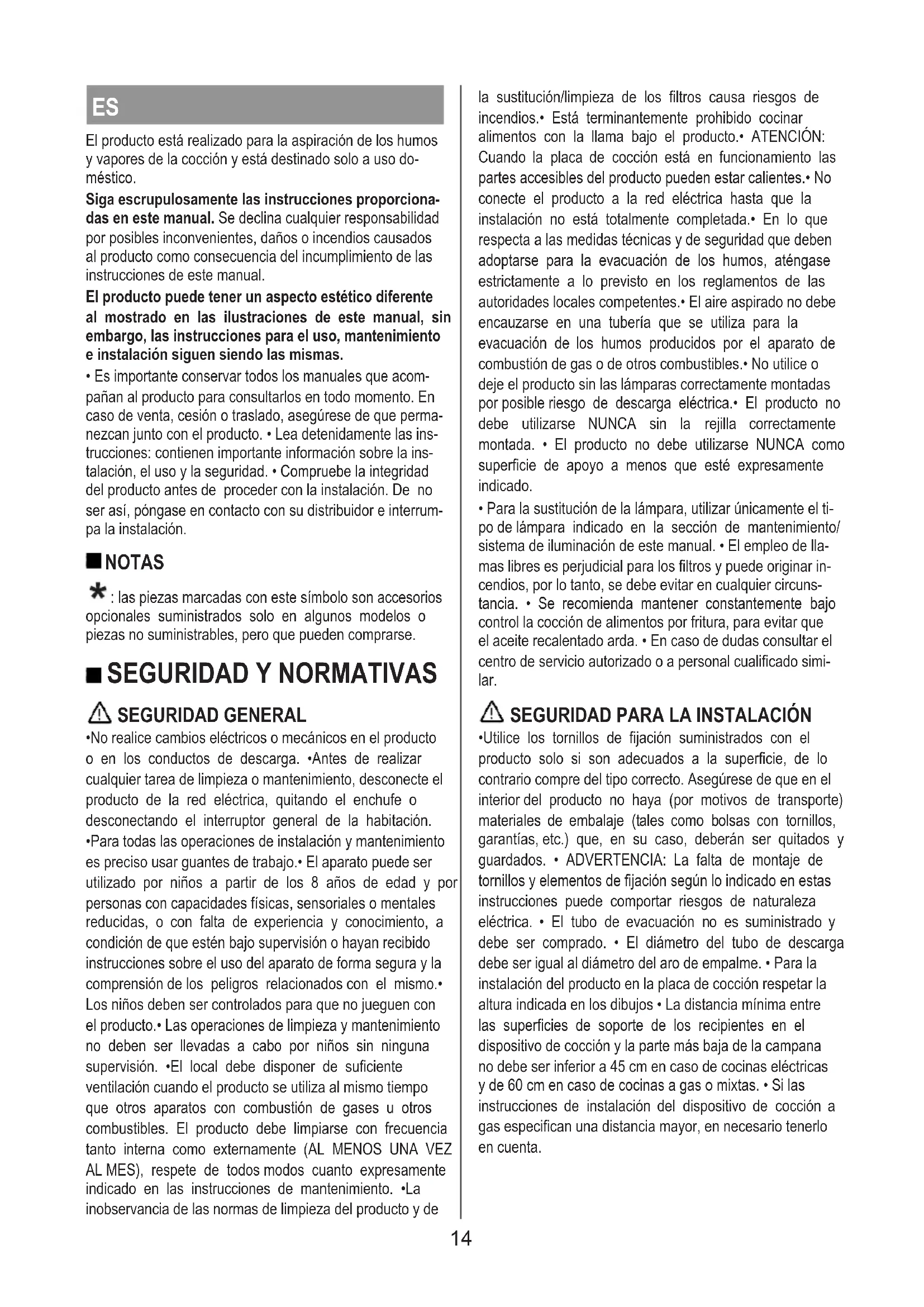 - Para todas las operaciones de instalación y mantenimiento es preciso usar guantes de trabajo.• El aparato puede ser utilizado por niños a partir de los 8 años de edad y por personas con capacidades físicas, sensoriales o mentales reducidas, o con falta de experiencia y conocimiento, a condición de que estén bajo supervisión o hayan recibido instrucciones sobre el uso del aparato de forma segura y la comprensión de los peligros relacionados con el mismo.• Los niños deben ser controlados para que no jueguen con el producto.• Las operaciones de limpieza y mantenimiento no deben ser llevadas a cabo por niños sin ninguna supervisión. •El local debe disponer de suficiente ventilación cuando el producto se utiliza al mismo tiempo que otros aparatos con combustión de gases u otros combustibles. El producto debe limpiarse con frecuencia tanto interna como externamente (AL MENOS UNA VEZ AL MES), respete de todos modos cuanto expresamente indicado en las instrucciones de mantenimiento. •La inobservancia de las normas de limpieza del producto y de la sustitución/limpieza de los filtros causa riesgos de incendios.• Está terminantemente prohibido cocinar alimentos con la llama bajo el producto.• ATENCIÓN: Cuando la placa de cocción está en funcionamiento las partes accesibles del producto pueden estar calientes.• No conecte el producto a la red eléctrica hasta que la instalación no está totalmente completada.• En lo que respecta a las medidas técnicas y de seguridad que deben adoptarse para la evacuación de los humos, aténgase estrictamente a lo previsto en los reglamentos de las autoridades locales competentes.• El aire aspirado no debe encauzarse en una tubería que se utiliza para la evacuación de los humos producidos por el aparato de combustión de gas o de otros combustibles.• No utilice o deje el producto sin las lámparas correctamente montadas por posible riesgo de descarga eléctrica.• El producto no debe utilizarse NUNCA sin la rejilla correctamente montada. • El producto no debe utilizarse NUNCA como superficie de apoyo a menos que esté expresamente indicado.