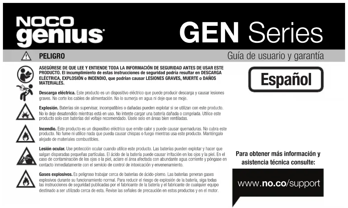 Ces conditions s’appliquent uniquement au produit durant la période de garantie. La période écoulée depuis la date d’achat (ou la période écoulée en fonction de la dateFR apparaissant au numéro de série si aucune preuve d’achat n’est fournie) ou les conditions mentionnées précédemment entraînent l’annulation de la garantie sans tracas. Retourner le produit accompagné de la documentation appropriée. Avec reçu : 0 à 3 ans : SANS frais. Avec preuve d’achat, la période de la garantie commence à la date de l’achat. Avec AUCUN reçu : 0 à 3 ans : AUCUNS frais. Avec AUCUNE preuve d’achat, la période la garantie commence à la date du numéro de série. Nous recommandons d’enregistrer votre produit NOCO afin de télécharger la preuve d’achat et de prolonger vos dates de garanties eectives. Vous pouvez enregistrer votre produit NOCO en ligne à : no.co/register. Pour toute question au sujet de votre garantie du produit, contactez le soutien de NOCO (courriel et numéro de téléphone ci-dessus) ou écrivez à : The NOCO Company, 30339 Diamond Parkway, #102, Glenwillow, OH 44139 USA.Guía de usuario y garantía PELIGRO ASEGÚRESE DE QUE LEE Y ENTIENDE TODA LA INFORMACIÓN DE SEGURIDAD ANTES DE USAR ESTE PRODUCTO. El incumplimiento de estas instrucciones de seguridad podría resultar en DESCARGA ELÉCTRICA, EXPLOSIÓN o INCENDIO, que podrían causar LESIONES GRAVES, MUERTE o DAÑOS MATERIALES. Descarga eléctrica. Este producto es un dispositivo eléctrico que puede producir descarga y causar lesiones graves. No corte los cables de alimentación. No lo sumerja en agua ni deje que se moje. Explosión. Baterías sin supervisar, incompatibles o dañadas pueden explotar si se utilizan con este producto. No lo deje desatendido mientras está en uso. No intente cargar una batería dañada o congelada. Utilice este producto solo con baterías del voltaje recomendado. Úselo solo en áreas bien ventiladas. Incendio. Este producto es un dispositivo eléctrico que emite calor y puede causar quemaduras. No cubra este producto. No fume ni utilice nada que pueda causar chispas o fuego mientras usa este producto. Manténgalo alejado de materiales combustibles. Lesión ocular. Use protección ocular cuando utilice este producto. Las baterías pueden explotar y hacer que salgan disparadas pequeñas partículas. El ácido de la batería puede causar irritación en los ojos y la piel. En el caso de contaminación de los ojos o la piel, aclare el área afectada con abundante agua corriente y póngase en contacto inmediatamente con el servicio de control de intoxicación y envenenamiento. Gases explosivos. Es peligroso trabajar cerca de baterías de ácido-plomo. Las baterías generan gases explosivos durante su funcionamiento normal. Para reducir el riesgo de explosión de la batería, siga todas las instrucciones de seguridad publicadas por el fabricante de la batería y el fabricante de cualquier equipo destinado a ser utilizado cerca de esta. Revise las señales de precaución en estos productos y en el motor. GEN Series Para obtener más información y asistencia técnica consulte: www.no.co/support EspañolES Acerca de GEN Series. El NOCO GEN Series cargador de batería integrado representa algunas de las tecnologías más innovadoras y avanzadas del mercado, lo que hace que cada carga sea simple y fácil. Es posiblemente el cargador más seguro y eficiente que jamás utilizará. La serie GEN cargador de batería integrado está diseñada para cargar todo tipo de baterías de plomo y ácido de 12 V, incluidas las húmedas (de inmersión), de gel, MF (sin mantenimiento), de CA (calcio), EFB (batería de inmersión mejorada) y AGM (alfombrilla de absorción de vidrio), además de las baterías de litio de 12 V (LiFePO4). Es adecuada para cargar capacidades de batería de hasta 120 amperios-hora y para mantener todos los tamaños de batería. Empezando. Antes de usar el cargador, lea detenidamente las precauciones específicas del fabricante de la batería y las tasas de carga recomendadas para la batería. Asegúrese de determinar el voltaje y la química de la batería consultando el manual del propietario de la batería antes de cargarla. Montaje. Es importante tener en cuenta la distancia a la batería. La longitud del cable de CC desde el cargador, ya sea con la abrazadera de la batería o los conectores del terminal de ojal, es de aproximadamente 72 pulgadas (182.88 cm). Deje una holgura de 12 pulgadas (30.4 cm) entre las conexiones. Proposición 65. ADVERTENCIA: Este producto puede exponerle a químicos incluyendo plomo y gases de escape, que son conocido s por el Estado de California como causante (s) de cáncer y defectos de nacimiento u otros daños reproductivos. Para mayor información, visite www.P65Warnings.ca.gov. Precaución. Utilice este producto solo para el propósito para el que fue diseñado. Debería haber una persona lo suficientemente cerca como para oír su voz o acudir en su ayuda en caso de emergencia. Ponga agua limpia y jabón a su alcance por si tuviera que usarlos en caso de contaminación con el ácido de la batería. Use protección ocular completa y ropa protectora cuando trabaje cerca de una batería. Lávese siempre las manos después de manipular baterías y materiales relacionados. No use objetos metálicos cuando trabaje con baterías, incluidas herramientas, relojes o joyas. Si cae metal sobre la batería, pueden saltar chispas o producirse un cortocircuito que podría provocar descarga eléctrica, incendio, explosión y causar lesiones, muerte o daños materiales. Menores de edad. Si el Comprador ha adquirido este producto para que lo use un menor de edad, el adulto que lo ha comprado se compromete a proporcionar instrucciones y advertencias detalladas al menor de edad antes de que este lo use. De no hacerlo, la responsabilidad recaerá únicamente sobre el Comprador, que se compromete a indemnizar a NOCO por el uso no intencionado o