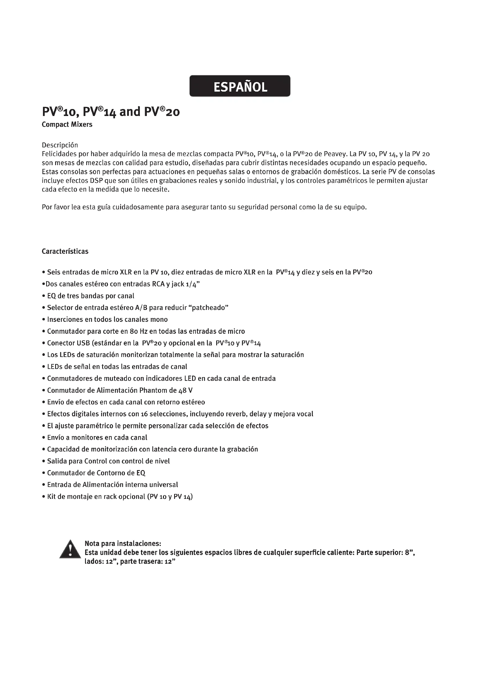 20 de Peavey. La PV 10, PV 14, y la PV 20 son mesas de mezclas con calidad para estudio, diseñadas para cubrir distintas necesidades ocupando un espacio pequeño. Estas consolas son perfectas para actuaciones en pequeñas salas o entornos de grabación domésticos. La serie PV de consolas incluye efectos DSP que son útiles en grabaciones reales y sonido industrial, y los controles paramétricos le permiten ajustar cada efecto en la medida que lo necesite. Por favor lea esta guía cuidadosamente para asegurar tanto su seguridad personal como la de su equipo. Características