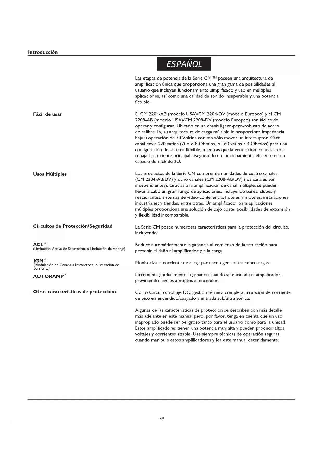 poseen una arquitectura de amplificación única que proporciona una gran gama de posibilidades al usuario que incluyen funcionamiento simplificado y uso en múltiples aplicaciones, así como una calidad de sonido insuperable y una potencia flexible. El CM 2204-AB (modelo USA)/CM 2204-DV (modelo Europeo) y el CM 2208-AB (modelo USA)/CM 2208-DV (modelo Europeo) son fáciles de operar y configurar. Ubicado en un chasis ligero-pero-robusto de acero de calibre 16, su arquitectura de carga múltiple le proporciona impedancia baja u operación de 70 Voltios con tan sólo mover un interruptor. Cada canal envía 220 vatios (70V o 8 Ohmios, o 160 vatios a 4 Ohmios) para una configuración de sistema flexible, mientras que la ventilación frontal-lateral rebaja la corriente principal, asegurando un funcionamiento eficiente en un espacio de rack de 2U. Los productos de la Serie CM comprenden unidades de cuatro canales (CM 2204-AB/DV) y ocho canales (CM 2208-AB/DV) (los canales son independientes). Gracias a la amplificación de canal múltiple, se pueden llevar a cabo un gran rango de aplicaciones, incluyendo bares, clubes y restaurantes; sistemas de vídeo-conferencia; hoteles y moteles; instalaciones industriales; y tiendas, entre otras. Un amplificador para aplicaciones múltiples proporciona una solución de bajo coste, posibilidades de expansión y flexibilidad incomparable. La Serie CM posee numerosas características para la protección del circuito, incluyendo: Reduce automáticamente la ganancia al comienzo de la saturación para prevenir el daño al amplificador y a la carga. Monitoriza la corriente de carga para proteger contra sobrecargas. Incrementa gradualmente la ganancia cuando se enciende el amplificador, previniendo niveles abruptos al encender. Corto Circuito, voltaje DC, gestión térmica completa, irrupción de corriente de pico en encendido/apagado y entrada sub/ultra sónica. Algunas de las características de protección se describen con más detalle más adelante en este manual pero, por favor, tenga en cuenta que un uso inapropiado puede ser peligroso tanto para el usuario como para la unidad. Estos amplificadores tienen una potencia muy alta y pueden producir altos voltajes y corrientes sizable. Use siempre técnicas de operación seguras cuando manipule estos amplificadores y lea este manual detenidamente.