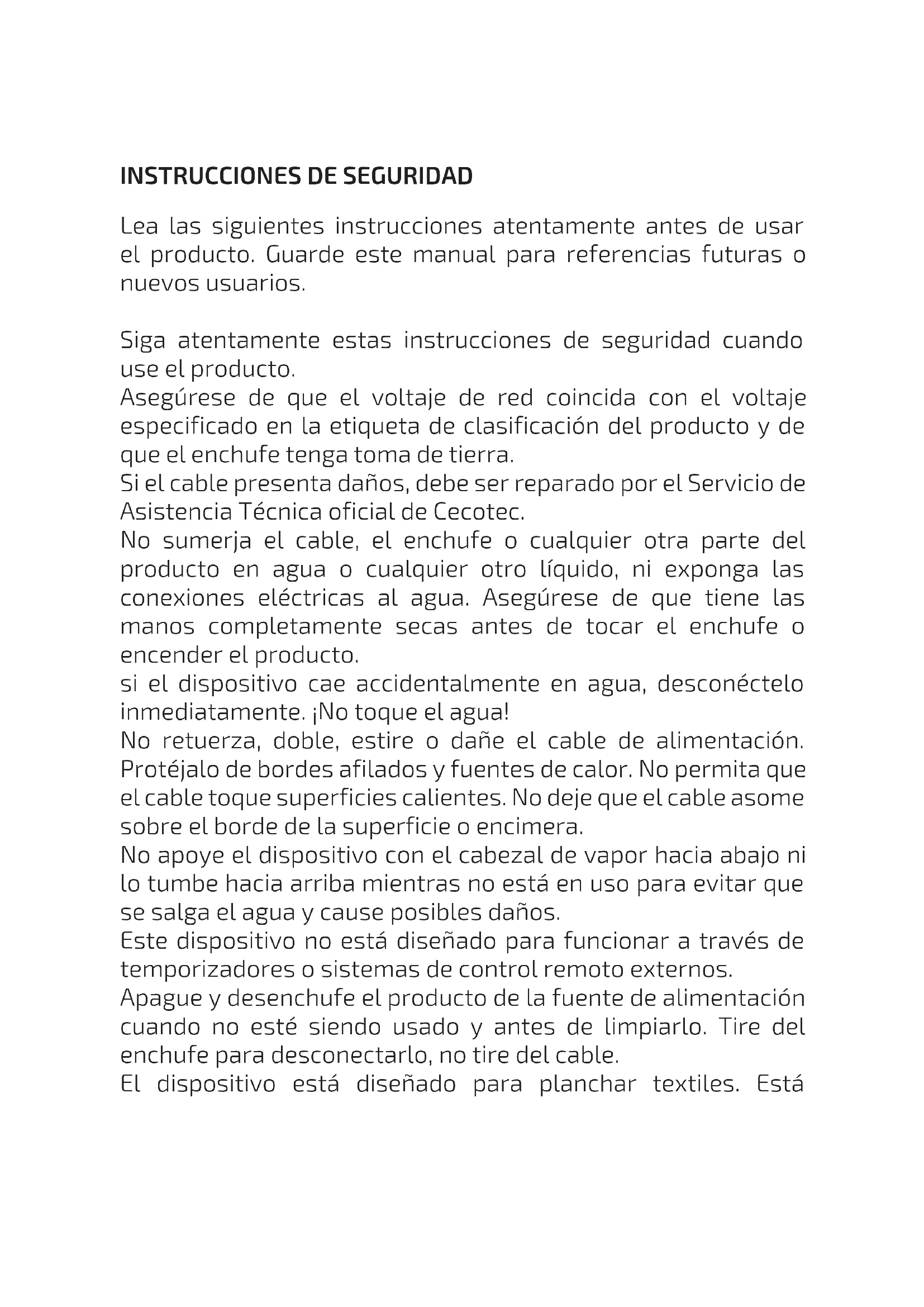Saque el producto de la caja. Asegúrese de que el producto incluye todos los accesorios y compruebe si hay daños visibles. En caso de observar alguno, contacte con el Servicio de Atención Técnica de Cecotec. Retire todo el material de embalaje, pegatinas o protectores pegados al cuerpo principal o al cable. Para evitar riesgos de quemaduras o daños, compruebe que el aparato funciona correctamente presionando el botón de vapor alejado de personas. Aviso: se recomienda encarecidamente el uso de agua destilada, purificada o filtrada para garantizar un funcionamiento óptimo. El agua del grifo contiene minerales que se acumulan con el tiempo.