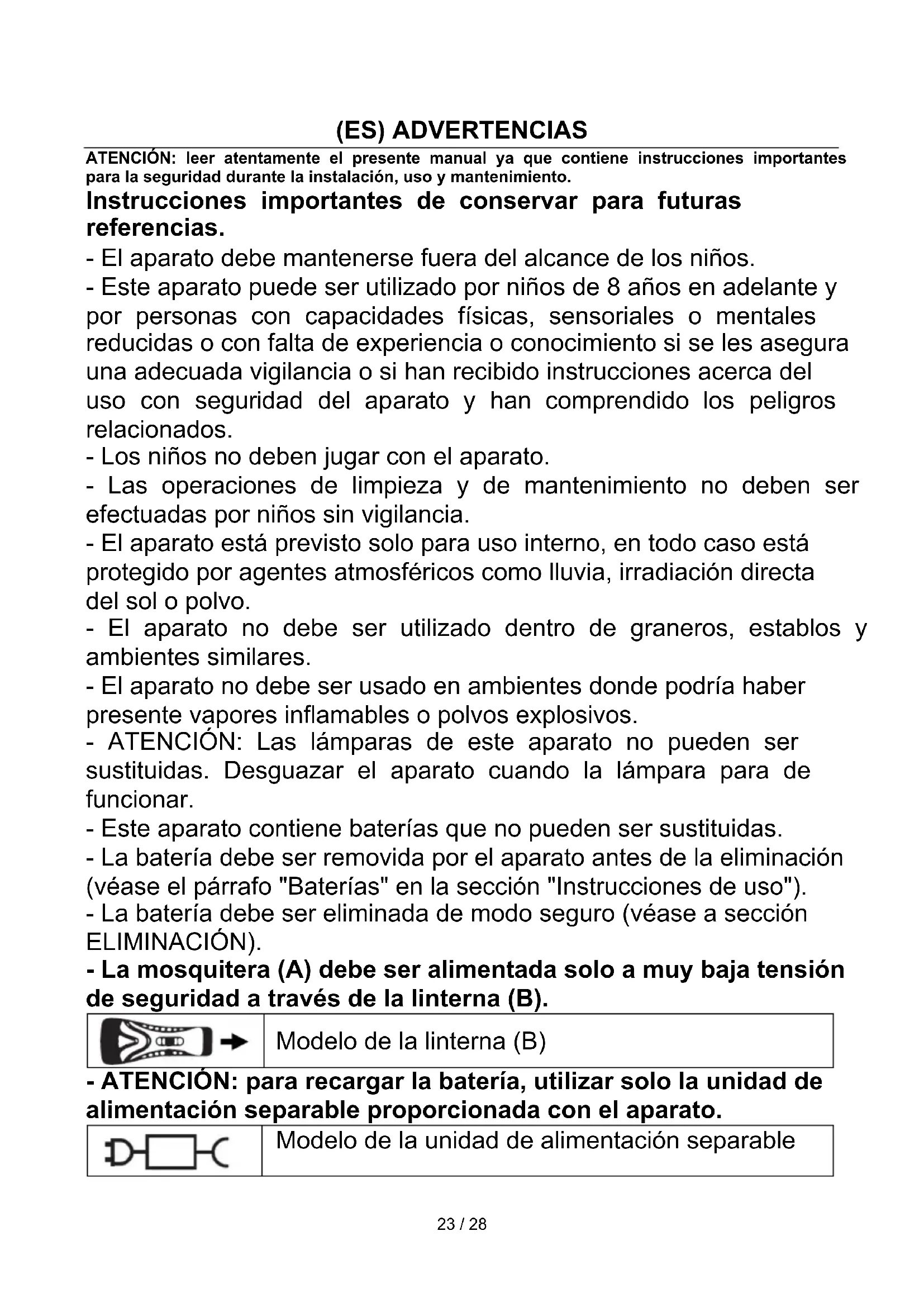 (ES) ADVERTENCIAS ATENCIÓN: leer atentamente el presente manual ya que contiene instrucciones importantes para la seguridad durante la instalación, uso y mantenimiento. Instrucciones importantes de conservar para futuras referencias. - El aparato debe mantenerse fuera del alcance de los niños. - Este aparato puede ser utilizado por niños de 8 años en adelante y por personas con capacidades físicas, sensoriales o mentales reducidas o con falta de experiencia o conocimiento si se les asegura una adecuada vigilancia o si han recibido instrucciones acerca del uso con seguridad del aparato y han comprendido los peligros relacionados. - Los niños no deben jugar con el aparato. - Las operaciones de limpieza y de mantenimiento no deben ser efectuadas por niños sin vigilancia. - El aparato está previsto solo para uso interno, en todo caso está protegido por agentes atmosféricos como lluvia, irradiación directa del sol o polvo. - El aparato no debe ser utilizado dentro de graneros, establos y ambientes similares. - El aparato no debe ser usado en ambientes donde podría haber presente vapores inflamables o polvos explosivos. - ATENCIÓN: Las lámparas de este aparato no pueden ser sustituidas. Desguazar el aparato cuando la lámpara para de funcionar. - Este aparato contiene baterías que no pueden ser sustituidas. - La batería debe ser removida por el aparato antes de la eliminación (véase el párrafo "Baterías" en la sección "Instrucciones de uso"). - La batería debe ser eliminada de modo seguro (véase a sección ELIMINACIÓN). - La mosquitera (A) debe ser alimentada solo a muy baja tensión de seguridad a través de la linterna (B).