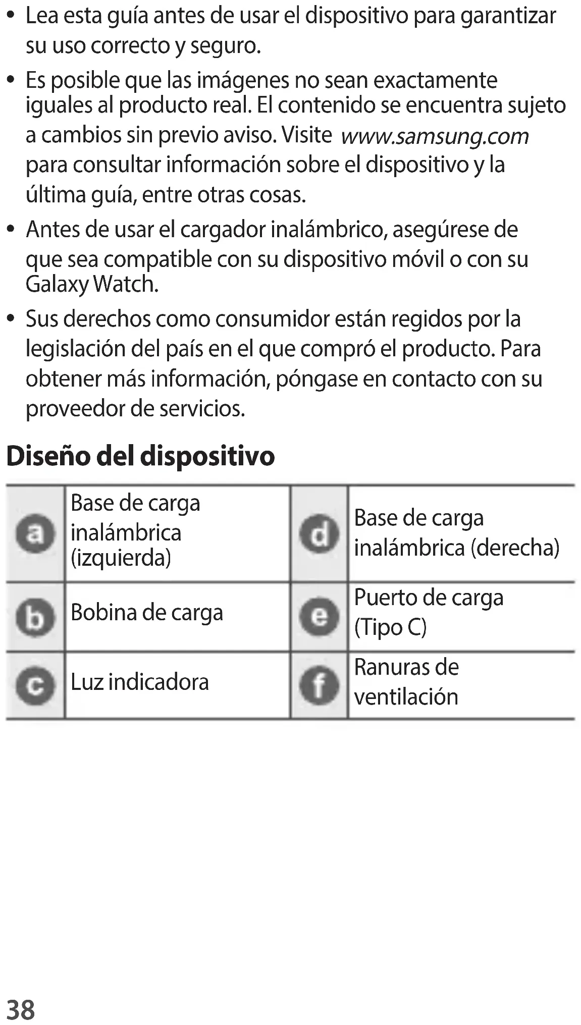 Si carga dos dispositivos móviles (además del Galaxy Watch) a la vez, no podrá usar la carga rápida inalámbrica 2.0. (Carga rápida inalámbrica 2.0: 10 W o más de carga inalámbrica con un cargador certificado original de Samsung) Información de seguridad Lea toda la información de seguridad antes de usar el dispositivo para garantizar un uso correcto y seguro. Para ver toda la información de seguridad, consulte la web de Samsung. Use baterías, cargadores, accesorios y suministros aprobados por el fabricante. No toque el dispositivo con las manos mojadas. No golpee ni deje caer el cargador ni el dispositivo.44 El dispositivo puede utilizarse en lugares con una temperatura ambiente entre 0°C y 35°C. Puede conservar el dispositivo a una temperatura ambiente entre -20°C y 50°C. Si utiliza o almacena el dispositivo a una temperatura fuera de los intervalos recomendados, este puede dañarse o puede reducirse la vida útil de la batería. Evite que la clavija multifunción, el extremo pequeño del cargador y las ranuras de ventilación entren en contacto con materiales conductores, como líquidos, polvo, polvos metálicos o grafito. No cubra ni bloquee las ranuras de ventilación del dispositivo. No deje que niños ni animales se metan el dispositivo en la boca. No desmonte, modifique ni repare el dispositivo. Las tarjetas con banda magnética, como tarjetas de crédito, tarjetas de teléfono, libretas de ahorros y tarjetas de embarque, pueden estropearse a causa de los campos magnéticos.45 Español Eliminación correcta La presencia de este símbolo en el producto, accesorios o material informativo que lo acompañan indica que ni el producto ni sus accesorios electrónicos (como el cargador, los auriculares o el cable USB) deberán eliminarse junto con otros residuos domésticos. Para obtener información sobre el compromiso de Samsung con el medio ambiente y las obligaciones específicas del producto con normativas concretas, como REACH, RAEE, sobre baterías, visite nuestra página de sostenibilidad en www.samsung.com