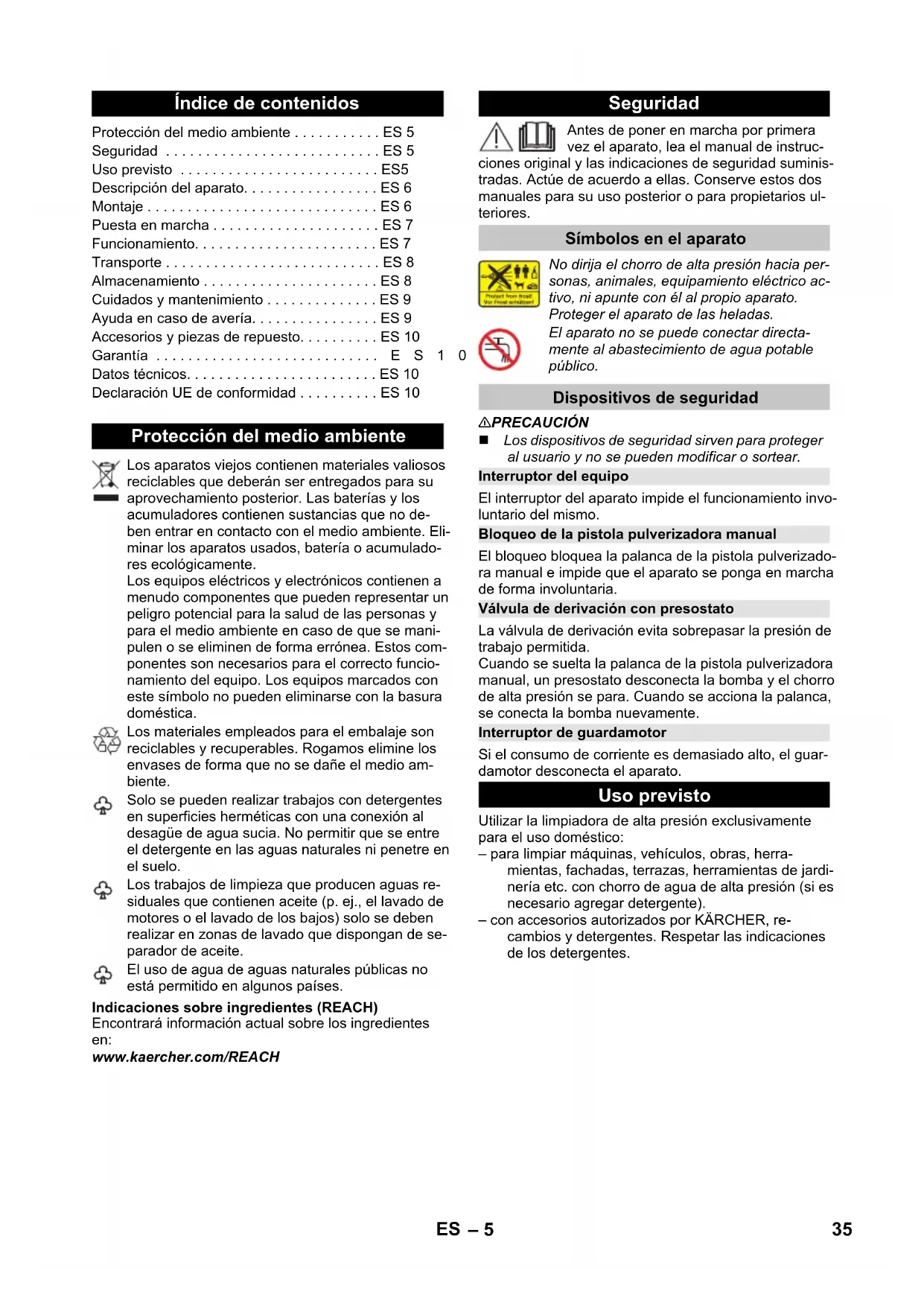 90 dB(A) Technische wijzigingen voorbehouden. EU-conformiteitsverklaring Product: Hogedrukreiniger Type: 1.324-xxx Van toepassing zijnde EU-richtlijnen 2006/42/EG (+2009/127/EG) 2014/30/EU 2011/65/EU 2000/14/EG Toegepaste geharmoniseerde normen EN 50581 EN 55014–1: 2006+A1: 2009+A2: 2011 EN 55014–2: 2015 EN 60335–1 EN 60335–2–79 EN 61000–3–2: 2014 EN 61000–3–3: 2013 EN 62233: 2008 Toegepaste conformiteitsbeoordelingsprocedure 2000/14/EG: Bijlage V Geluidsvermogensniveau dB(A) Gemeten: 88 Gegarandeerd: 90 Winnenden, 2018/10/01 Chairman of the Board of Management Director Regulatory Affairs & Certification 34 NL– 5 Indicaciones sobre ingredientes (REACH) Encontrará información actual sobre los ingredientes en: www.kaercher.com/REACH Antes de poner en marcha por primera vez el aparato, lea el manual de instruc- ciones original y las indicaciones de seguridad suminis- tradas. Actúe de acuerdo a ellas. Conserve estos dos manuales para su uso posterior o para propietarios ul- teriores. 몇 PRECAUCIÓN Los dispositivos de seguridad sirven para proteger al usuario y no se pueden modificar o sortear. El interruptor del aparato impide el funcionamiento invo- luntario del mismo. El bloqueo bloquea la palanca de la pistola pulverizado- ra manual e impide que el aparato se ponga en marcha de forma involuntaria. La válvula de derivación evita sobrepasar la presión de trabajo permitida. Cuando se suelta la palanca de la pistola pulverizadora manual, un presostato desconecta la bomba y el chorro de alta presión se para. Cuando se acciona la palanca, se conecta la bomba nuevamente. Si el consumo de corriente es demasiado alto, el guar- damotor desconecta el aparato. Utilizar la limpiadora de alta presión exclusivamente para el uso doméstico: – para limpiar máquinas, vehículos, obras, herra- mientas, fachadas, terrazas, herramientas de jardi- nería etc. con chorro de agua de alta presión (si es necesario agregar detergente). – con accesorios autorizados por KÄRCHER, re- cambios y detergentes. Respetar las indicaciones de los detergentes. Índice de contenidos Protección del medio ambiente . . . . . . . . . . . ES 5 Seguridad . . . . . . . . . . . . . . . . . . . . . . . . . . . ES 5 Uso previsto . . . . . . . . . . . . . . . . . . . . . . . . . ES5 Descripción del aparato. . . . . . . . . . . . . . . . . ES 6 Montaje . . . . . . . . . . . . . . . . . . . . . . . . . . . . . ES 6 Puesta en marcha . . . . . . . . . . . . . . . . . . . . . ES 7 Funcionamiento. . . . . . . . . . . . . . . . . . . . . . . ES 7 Transporte . . . . . . . . . . . . . . . . . . . . . . . . . . . ES 8 Almacenamiento . . . . . . . . . . . . . . . . . . . . . . ES 8 Cuidados y mantenimiento . . . . . . . . . . . . . . ES 9 Ayuda en caso de avería. . . . . . . . . . . . . . . . ES 9 Accesorios y piezas de repuesto. . . . . . . . . . ES 10 Garantía . . . . . . . . . . . . . . . . . . . . . . . . . . . .ES10 Datos técnicos. . . . . . . . . . . . . . . . . . . . . . . . ES 10 Declaración UE de conformidad . . . . . . . . . . ES 10 Protección del medio ambiente Los aparatos viejos contienen materiales valiosos reciclables que deberán ser entregados para su aprovechamiento posterior. Las baterías y los acumuladores contienen sustancias que no de- ben entrar en contacto con el medio ambiente. Eli- minar los aparatos usados, batería o acumulado- res ecológicamente. Los equipos eléctricos y electrónicos contienen a menudo componentes que pueden representar un peligro potencial para la salud de las personas y para el medio ambiente en caso de que se mani- pulen o se eliminen de forma errónea. Estos com- ponentes son necesarios para el correcto funcio- namiento del equipo. Los equipos marcados con este símbolo no pueden eliminarse con la basura doméstica. Los materiales empleados para el embalaje son reciclables y recuperables. Rogamos elimine los envases de forma que no se dañe el medio am- biente. Solo se pueden realizar trabajos con detergentes en superficies herméticas con una conexión al desagüe de agua sucia. No permitir que se entre el detergente en las aguas naturales ni penetre en el suelo. Los trabajos de limpieza que producen aguas re- siduales que contienen aceite (p. ej., el lavado de motores o el lavado de los bajos) solo se deben realizar en zonas de lavado que dispongan de se- parador de aceite. El uso de agua de aguas naturales públicas no está permitido en algunos países. Seguridad Símbolos en el aparato No dirija el chorro de alta presión hacia per- sonas, animales, equipamiento eléctrico ac- tivo, ni apunte con él al propio aparato. Proteger el aparato de las heladas. El aparato no se puede conectar directa- mente al abastecimiento de agua potable público. Dispositivos de seguridad Interruptor del equipo Bloqueo de la pistola pulverizadora manual Válvula de derivación con presostato Interruptor de guardamotor Uso previsto 35ES– 6 El contenido de suministro de su aparato (dependiendo del modelo) está ilustrado en el embalaje. Este manual de instrucciones describe todas las opciones posibles. En caso de detectar que faltan accesorios o o que han surgido daños durante el transporte, informe a su distri- buidor. Ilustraciones, véase la contraportada 3 1 Pieza de acoplamiento para la conexión de agua 2 Conexión de agua con filtro incorporado 3 Manguera de alta presión 4 Guía de tubos flexibles 5 Zona de recogida para lanzas dosificadoras 6 Almacenamiento / Posición de aparcamiento para la pistola pulverizadora manula 7 Toma Plug 'n' Clean de detergente 8 Asa de transporte 9 Mango para el transporte, despegable 10 Portamangueras 11 Conexión de alta presión 12 Interruptor del aparato „0/OFF“ / „I/ON“ 13 Cable de conexión a red y enchufe de red 14 Placa de características 15 Compartimento para los accesorios 16 Ganchos para la fijación a la alimentación 17 Alimentación para el compartimento de accesorios 18 Rueda de transporte 19 Pata con asa