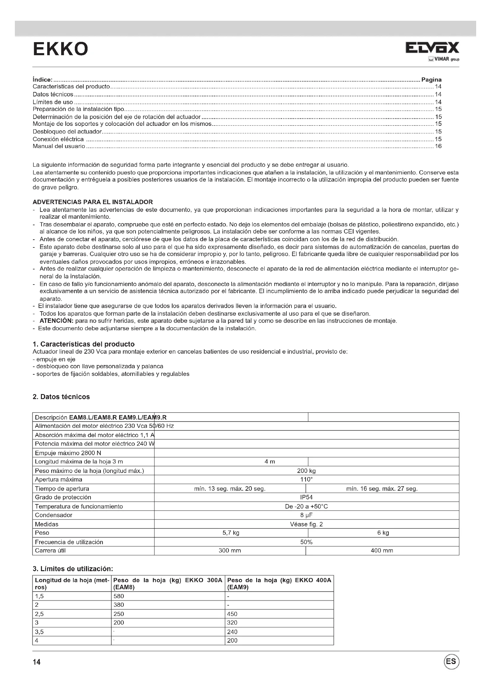Descripción EAM8.L/EAM8.R EAM9.L/EAM9.R Alimentación del motor eléctrico 230 Vca 50/60 Hz Absorción máxima del motor eléctrico 1,1 A Potencia máxima del motor eléctrico 240 W Empuje máximo 2800 N Longitud máxima de la hoja 3 m 4 m Peso máximo de la hoja (longitud máx.) 200 kg Apertura máxima 110° Tiempo de apertura mín. 13 seg. máx. 20 seg. mín. 16 seg. máx. 27 seg. Grado de protección IP54 Temperatura de funcionamiento De -20 a +50°C Condensador 8 μF Medidas Véase fig. 2 Peso 5,7 kg 6 kg Frecuencia de utilización 50% Carrera útil 300 mm 400 mm Longitud de la hoja (met- ros) Peso de la hoja (kg) EKKO 300A (EAM8) Peso de la hoja (kg) EKKO 400A (EAM9) 1,5 580 - 2 380 - 2,5 250 450