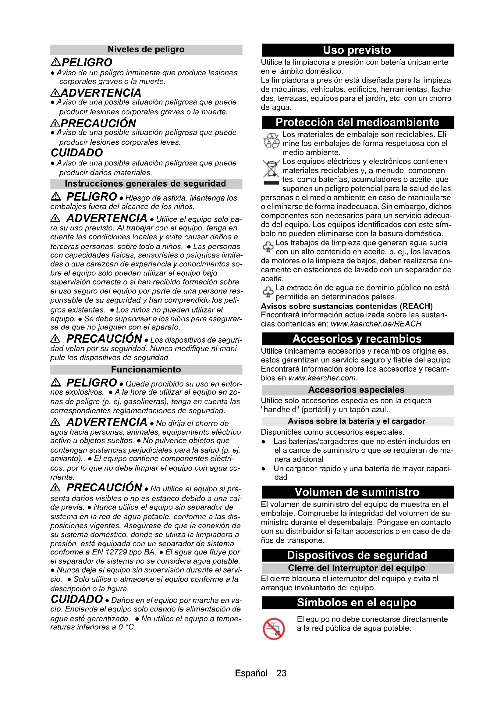 - Declaración de conformidad UE Chairman of the Board of Management Director Regulatory Affairs & Certification H. Jenner S. ReiserEspañol 23 Niveles de peligro PELIGRO ● Aviso de un peligro inminente que produce lesiones corporales graves o la muerte. 몇 ADVERTENCIA ● Aviso de una posible situación peligrosa que puede producir lesiones corporales graves o la muerte. 몇 PRECAUCIÓN ● Aviso de una posible situación peligrosa que puede producir lesiones corporales leves. CUIDADO ● Aviso de una posible situación peligrosa que puede producir daños materiales. Instrucciones generales de seguridad PELIGRO ● Riesgo de asfixia. Mantenga los embalajes fuera del alcance de los niños. 몇 ADVERTENCIA ● Utilice el equipo solo pa- ra su uso previsto. Al trabajar con el equipo, tenga en cuenta las condiciones locales y evite causar daños a terceras personas, sobre todo a niños. ● Las personas con capacidades físicas, sensoriales o psíquicas limita- das o que carezcan de experiencia y conocimientos so- bre el equipo solo pueden utilizar el equipo bajo supervisión correcta o si han recibido formación sobre el uso seguro del equipo por parte de una persona res- ponsable de su seguridad y han comprendido los peli- gros existentes. ● Los niños no pueden utilizar el equipo. ● Se debe supervisar a los niños para asegurar- se de que no jueguen con el aparato. 몇 PRECAUCIÓN ● Los dispositivos de seguri- dad velan por su seguridad. Nunca modifique ni mani- pule los dispositivos de seguridad. Funcionamiento PELIGRO ● Queda prohibido su uso en entor- nos explosivos. ● A la hora de utilizar el equipo en zo- nas de peligro (p. ej. gasolineras), tenga en cuenta las correspondientes reglamentaciones de seguridad. 몇 ADVERTENCIA ● No dirija el chorro de agua hacia personas, animales, equipamiento eléctrico activo u objetos sueltos. ● No pulverice objetos que contengan sustancias perjudiciales para la salud (p. ej. amianto). ● El equipo contiene componentes eléctri- cos, por lo que no debe limpiar el equipo con agua co- rriente. 몇 PRECAUCIÓN ● No utilice el equipo si pre- senta daños visibles o no es estanco debido a una caí- da previa. ● Nunca utilice el equipo sin separador de sistema en la red de agua potable, conforme a las dis- posiciones vigentes. Asegúrese de que la conexión de su sistema doméstico, donde se utiliza la limpiadora a presión, esté equipada con un separador de sistema conforme a EN 12729 tipo BA. ● El agua que fluye por el separador de sistema no se considera agua potable. ● Nunca deje el equipo sin supervisión durante el servi- cio. ● Solo utilice o almacene el equipo conforme a la descripción o la figura. CUIDADO ● Daños en el equipo por marcha en va- cío. Encienda el equipo solo cuando la alimentación de agua esté garantizada. ● No utilice el equipo a tempe- raturas inferiores a 0 °C. Uso previsto Utilice la limpiadora a presión con batería únicamente en el ámbito doméstico. La limpiadora a presión está diseñada para la limpieza de máquinas, vehículos, edificios, herramientas, facha- das, terrazas, equipos para el jardín, etc. con un chorro de agua. Protección del medioambiente Los materiales de embalaje son reciclables. Eli- mine los embalajes de forma respetuosa con el medio ambiente. Los equipos eléctricos y electrónicos contienen materiales reciclables y, a menudo, componen- tes, como baterías, acumuladores o aceite, que suponen un peligro potencial para la salud de las personas o el medio ambiente en caso de manipularse o eliminarse de forma inadecuada. Sin embargo, dichos componentes son necesarios para un servicio adecua- do del equipo. Los equipos identificados con este sím- bolo no pueden eliminarse con la basura doméstica. Los trabajos de limpieza que generan agua sucia con un alto contenido en aceite, p. ej., los lavados de motores o la limpieza de bajos, deben realizarse úni- camente en estaciones de lavado con un separador de aceite. La extracción de agua de dominio público no está permitida en determinados países. Avisos sobre sustancias contenidas (REACH) Encontrará información actualizada sobre las sustan- cias contenidas en: www.kaercher.de/REACH Accesorios y recambios Utilice únicamente accesorios y recambios originales, estos garantizan un servicio seguro y fiable del equipo. Encontrará información sobre los accesorios y recam- bios en www.kaercher.com. Accesorios especiales Utilice solo accesorios especiales con la etiqueta "handheld" (portátil) y un tapón azul. Avisos sobre la batería y el cargador Disponibles como accesorios especiales: ● Las baterías/cargadores que no estén incluidos en el alcance de suministro o que se requieran de ma- nera adicional ● Un cargador rápido y una batería de mayor capaci- dad Volumen de suministro El volumen de suministro del equipo de muestra en el embalaje. Compruebe la integridad del volumen de su- ministro durante el desembalaje. Póngase en contacto con su distribuidor si faltan accesorios o en caso de da- ños de transporte. Dispositivos de seguridad Cierre del interruptor del equipo El cierre bloquea el interruptor del equipo y evita el arranque involuntario del equipo. Símbolos en el equipo El equipo no debe conectarse directamente a la red pública de agua potable.24 Español Descripción del equipo En este manual de instrucciones se describe el equipa- miento máximo. Existen diferencias en el alcance del suministro según el modelo (véase el embalaje). Véanse las figuras en la página de gráficos Figura A 1 Boquilla de chorro plano para tareas de limpieza normales 2 Desbloqueo de la boquilla 3 Tubo pulverizador 4 Placa de características 5 Tecla de desbloqueo de la batería 6 Cierre del interruptor del equipo 7 Interruptor del equipo 8 Conexión de agua con filtro fino 9 Limpiadora a presión con batería 10 Acoplamiento de la conexión de agua 11 **Manguera de riego (reforzada con tela, diámetro de al meno