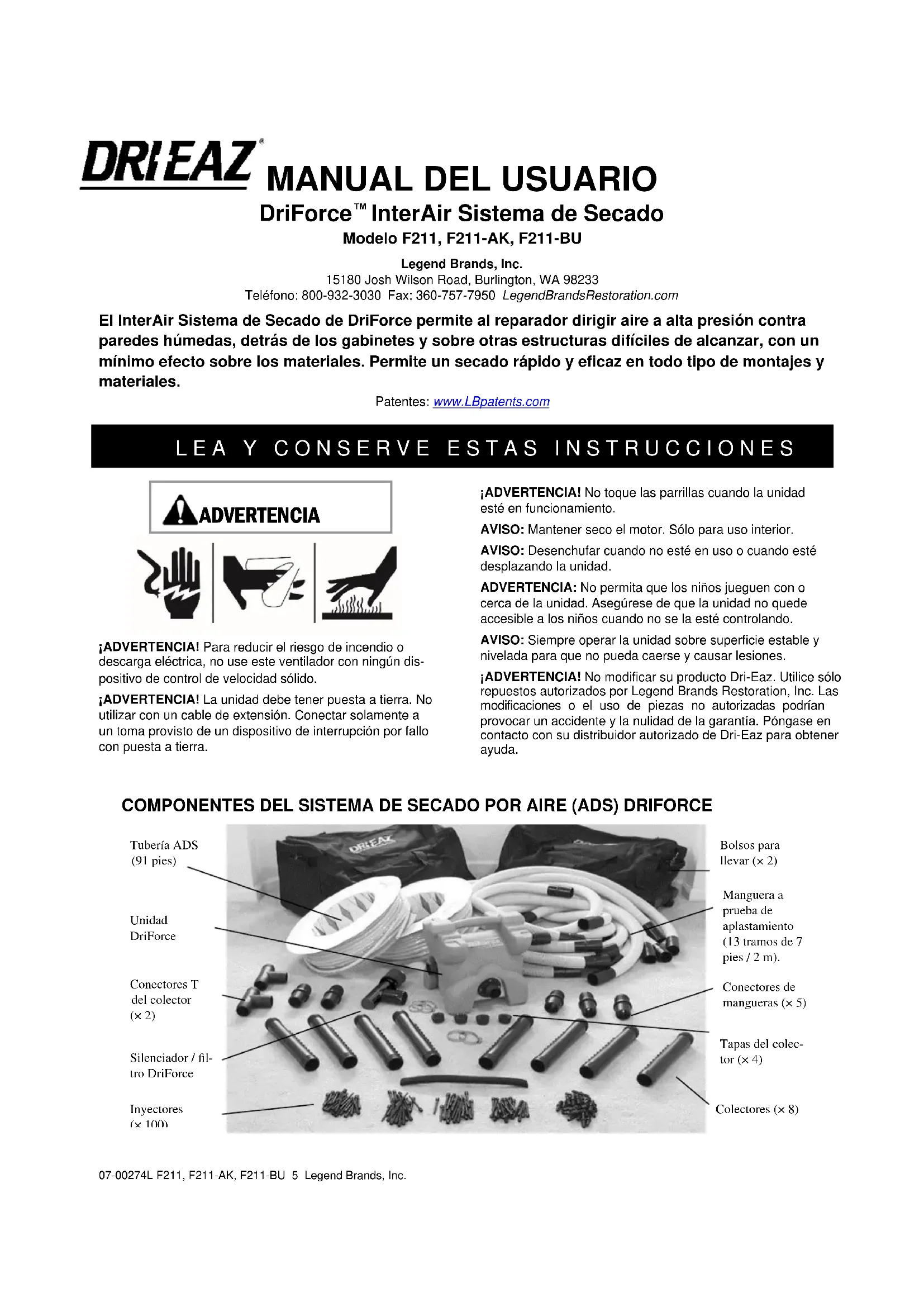 1 pie 30 cm Salidas 6 y 7 Para instalar la tubería, deslice uno de los extremos sobre la boquilla de salida del colector e inserte un inyector en el otro extremo. Sellar firmemente con un tapón el último co- lector en cada ejecución de ADS. Ahora coloque los inyec- tores en los agujeros que ha perforado o taladrado en la pared, gabinete u otra estructura. Asegúrese de que todos los conectores en T, puños de mangueras, colectores, líneas de suministro e inyectores están instalados correctamente. Fije el ADS al DriForce. Enchufe el DriForce y enciéndalo por un instante, verifi- cando que las conexiones no tengan fugas de aire. Si es necesario, utilice una abrazadera para sellar cualquier fuga en los lugares en donde los productos de vinilo conectan con las sujeciones de las mangueras, etc. Procedimiento de Secado Fase 1: Secado por Extracción de Aire (aspirado) Fije los ADS a la toma de aspiración de la unidad del soplador DriForce y encienda la unidad. Utilice el modo de extracción de aire (aspiradora) para ex- traer el aire húmedo de las cavidades estructurales. Operar en la Fase 1 hasta que la humedad del aire que se extrae de la zona afectada sea similar a la de un área de trabajo no afectada. Puede utilizar un higrómetro para comparar las lecturas de humedad relativa entre la salida de la DriForce y sus alrededores. NOTA: Asegúrese de colocar la manguera de aspiración a la salida del DriForce y de orientar el escape hacia afuera de la estructura. En el modo de extracción de aire, no utilice el silenciador-filtro provisto con el DriForce. No es un filtro HEPA y puede no llegar a capturar adecuadamente los contaminantes que ingresen en el DriForce. Utilice el si- lenciador-filtro sólo en el modo de inyección (soplador), que se describe a continuación. Fase 2: Secado por Inyección de Aire (Ventilador) Coloque los ADS de la aspiradora a la salida de presión del DriForce, instale el silenciador-filtro en la entrada de aire y encienda la unidad. Una vez que la humedad en el interior de la cavidad estruc- tural sea igual a la del ambiente, será el momento de cam- biar al modo de inyección de aire. Inyectar aire ambiente en las cavidades estructurales ayudará a continuar el proceso de secado. Esto es especialmente cierto si se permite la deshumidificación del aire del espacio. CONSEJO: Al secar el interior de las paredes, utilice un taladro para generar un pequeño orificio de ventilación justo por encima del punto más alto de humedad en la pared. Esto permitirá un orificio de ventilación y ayudará a acelerar el proceso de secado al permitir un mayor flujo de aire a través de los materiales afectados. Luego podrá ser fácil- mente parcheado. CONSEJO: Para maximizar el secado en paredes revesti- das, con azulejos, doble capa, empapeladas con vinilo o con pintura impermeable, paredes de listones y yeso, antiflamas y paredes aisladas, coloque un inyector adicional por cada pie lineal. CONSEJO: Acelere el secado con deshumidificadores. Para incrementar la velocidad de secado durante la Fase 2, utilice un deshumidificador para suministrar aire seco directamente al DriForce. Coloque la salida de aire seco de un deshumidi- ficador cerca de la entrada de aire del DriForce, o dirija por un conducto la salida del deshumidificador hacia la entrada del DriForce. Los deshumidificadores desecantes son espe- cialmente útiles para este propósito, ya que el aire extre- madamente seco que generan puede acelerar el secado de materiales y conjuntos de alta densidad. AVISO: NO pegar con cinta ni sellar los conductos del deshumidificador a la entrada DriForce, ya que podría dese- quilibrar el flujo de aire a través del deshumidificador y posi- blemente dañarlo. Control del Olor y del Moho Si usted sospecha que dentro de las cavidades se puede estar generando hongos y moho, siga los procedimientos in- dustriales y normas de seguridad para su eliminación. MANTENIMIENTO ADVERTENCIA: Antes de cualquier tarea de mantenimiento o limpieza desenchufe la unidad Según sea necesario Compruebe la entrada y salida de la unidad DriForce para ver si presentan obstrucciones o desechos después de cada uso. Inspeccione el silenciador-filtro y límpielo si es necesario, aspirándolo o lavándolo. Compruebe colectores, tuberías, inyectores y otros componentes del ADS, y reemplácelos de ser necesario. Limpie el exterior de los componentes del DriForce y del ADS con un limpiador de vinilo y un protector. A través de su distribuidor de Dri-Eaz estarán disponibles repuestos, servicios, mantenimiento y garantía.07-00274L F211, F211-AK, F211-BU 9 Legend Brands, Inc. ESPECIFICACIONES InterAir Sistema de Secado DriForce (F211) UNIDAD BASE Dimensiones (A × A × P) 14 × 14 × 12 pulg. 35 × 35 × 30 cm Amperaje 5,4 amperios Potencia 115V / 60Hz Flujo de aire total del sistema (máx.) 100 CFM | 2,3 CMM Presión de trabajo estático (ele- vación de agua) 38 pulg. | 97 cm Peso (sólo la unidad base) 14,5 libras. | 6,3 kg Seguridad ETL listado UL 507 y CSA C22.2 N° 113 SISTEMA DE ENTREGA DE AIRE (ADS) Tubería ADS anti-aplastamiento 91 pies (28 m). Tubería de 1½ pulg. (3,8 cm). Pre-cortada en 13 secciones de 7 pies (2 m). Tamaño del orificio de inyector Menos de ¼ pulg. (6 mm) Tubería flexible 400 pies (122 m). Tubería ID de ⅜ pulg (0,375 mm) Sistema de transporte / guardado 2 bolsos de lona estilo maleta con manija y ruedas Modos de secado Por presión, ya sea positiva o negativa Piezas incluidas 100 inyectores, 8 colectores (de 12 salidas cada uno), 4 tapas de colectores, 4 accesorios de acoplamiento, 2 abrazaderas, 2 accesorios-T, 13 montajes de manguera con puños, 25 conexiones extensoras de tuberías, 1 silenciador.07-00274L F211, F211-AK, F211-BU 10 Legend Brands, Inc. Guide d’utilisation Système de séchage DriForce