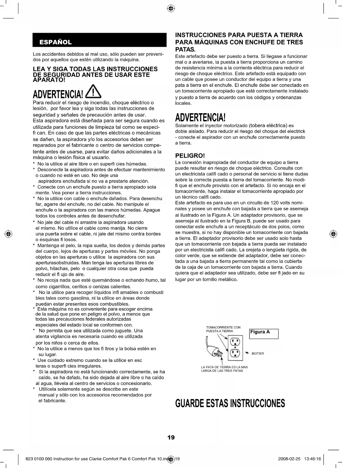 PARA MÁQUINAS CON ENCHUFE DE TRES PATAS. Este artefacto debe ser puesto a tierra. Si llegase a funcionar mal o a averiarse, la puesta a tierra proporciona un camino de resistencia mínima a la corriente eléctrica para reducir el riesgo de choque eléctrico. Este artefacto está equipado con un cable que posee un conductor del equipo a tierra y una pata a tierra en el enchufe. El enchufe debe ser conectado en un tomacorriente apropiado que esté correctamente instalado y puesto a tierra de acuerdo con los códigos y ordenanzas locales. ADVERTENCIA! Solamente el inyector motorizado (tobera eléctrica) es doble aislado. Para reducir el riesgo del choque del electrick - conecte el aspirador con un enchufe correctamente puesto a tierra. PELIGRO! La conexión inapropiada del conductor de equipo a tierra puede resultar en riesgo de choque eléctrico. Consulte con un electricista califi cado o personal de servicio si tiene dudas sobre la correcta puesta a tierra del tomacorriente. No modi- fi que el enchufe provisto con el artefacto. Si no encaja en el tomacorriente, haga instalar el tomacorriente apropiado por un técnico califi cado. Este artefacto es para uso en un circuito de 120 volts nomi- nales y posee un enchufe con bajada a tierra que se asemeja al ilustrado en la Figura A. Un adaptador provisorio, que se asemeja al ilustrado en la Figura B, puede ser usado para conectar este enchufe a un receptáculo de dos polos, como se muestra, si no hay disponible un tomacorriente con bajada a tierra. El adaptador provisorio debe ser usado solo hasta que un tomacorriente con bajada a tierra pueda ser instalado por un electricista califi cado. La orejeta o lengüeta rígida, de color verde, que se extiende del adaptador, debe ser conec- tada a una bajada a tierra permanente tal como la cubierta de la caja de un tomacorriente con bajada a tierra. Cuando quiera que el adaptador sea utilizado, debe ser fi jado en su lugar por un tornillo metálico. Los accidentes debidos al mal uso, sólo pueden ser preveni- dos por aquellos que estén utilizando la máquina.