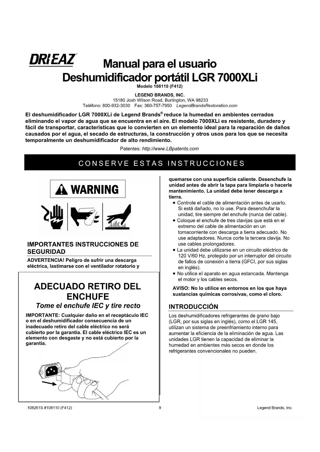 chemicals, including lead and phthalates, known to the State of California to cause cancer, birth defects, or other reproductive harm. For more information, go to P65Warnings.ca.gov108261S #108110 (F412) 9 Legend Brands, Inc. Manual para el usuario Deshumidificador portátil LGR 7000XLi Modelo 108110 (F412) LEGEND BRANDS, INC. 15180 Josh Wilson Road, Burlington, WA 98233 Teléfono: 800-932-3030 Fax: 360-757-7950 LegendBrandsRestoration.com El deshumidificador LGR 7000XLi de Legend Brands reduce la humedad en ambientes cerrados eliminando el vapor de agua que se encuentra en el aire. El modelo 7000XLi es resistente, duradero y fácil de transportar, características que lo convierten en un elemento ideal para la reparación de daños causados por el agua, el secado de estructuras, la construcción y otros usos para los que se necesita temporalmente un deshumidificador de alto rendimiento. Patentes: http://www.LBpatents.com