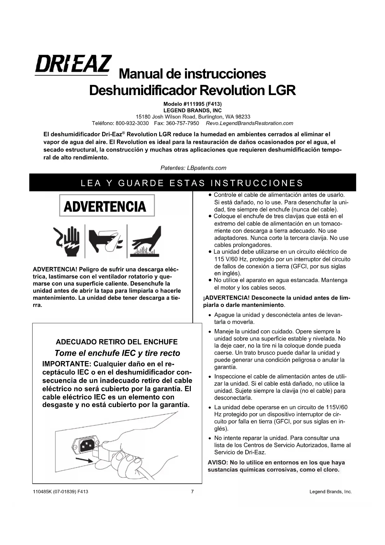 Tome el enchufe IEC y tire recto IMPORTANTE: Cualquier daño en el re- ceptáculo IEC o en el deshumidificador con- secuencia de un inadecuado retiro del cable eléctrico no será cubierto por la garantía. El cable eléctrico IEC es un elemento con desgaste y no está cubierto por la garantía.110485K (07-01839) F413 8 Legend Brands, Inc.