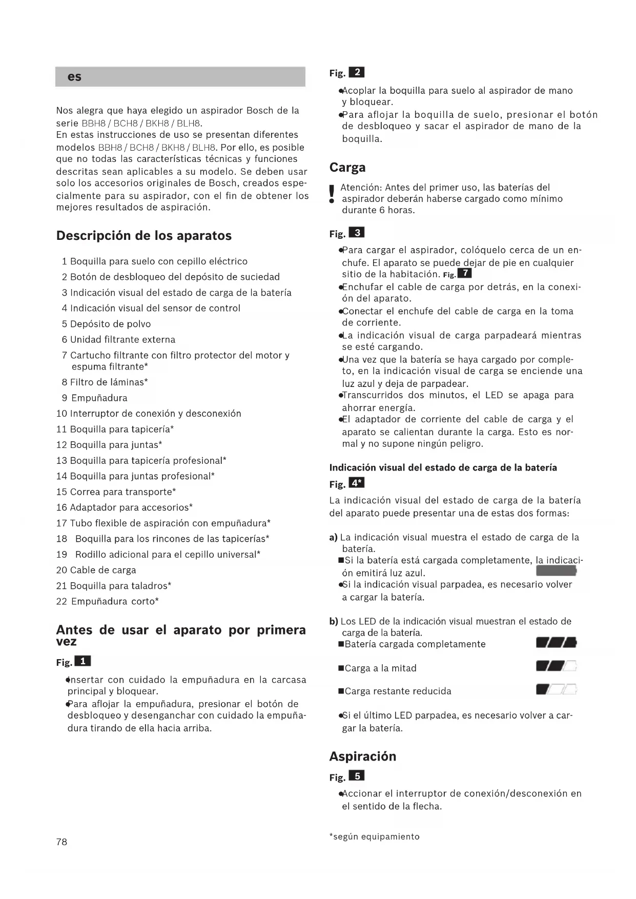 Nos alegra que haya elegido un aspirador Bosch de la serie BBH8 / BCH8 / BKH8 / BLH8. En estas instrucciones de uso se presentan diferentes modelos BBH8 / BCH8 / BKH8 / BLH8. Por ello, es posible que no todas las características técnicas y funciones descritas sean aplicables a su modelo. Se deben usar solo los accesorios originales de Bosch, creados espe- cialmente para su aspirador, con el fin de obtener los mejores resultados de aspiración. Descripción de los aparatos 1 Boquilla para suelo con cepillo eléctrico 2 Botón de desbloqueo del depósito de suciedad 3 Indicación visual del estado de carga de la batería 4 Indicación visual del sensor de control 5 Depósito de polvo 6 Unidad filtrante externa 7 Cartucho filtrante con filtro protector del motor y espuma filtrante* 8 Filtro de láminas* 9 Empuñadura 10 Interruptor de conexión y desconexión 11 Boquilla para tapicería* 12 Boquilla para juntas* 13 Boquilla para tapicería profesional* 14 Boquilla para juntas profesional* 15 Correa para transporte* 16 Adaptador para accesorios* 17 Tubo flexible de aspiración con empuñadura* 18 Boquilla para los rincones de las tapicerías* 19 Rodillo adicional para el cepillo universal* 20 Cable de carga 21 Boquilla para taladros* 22 Empuñadura corto* Antes de usar el aparato por primera vez Fig.