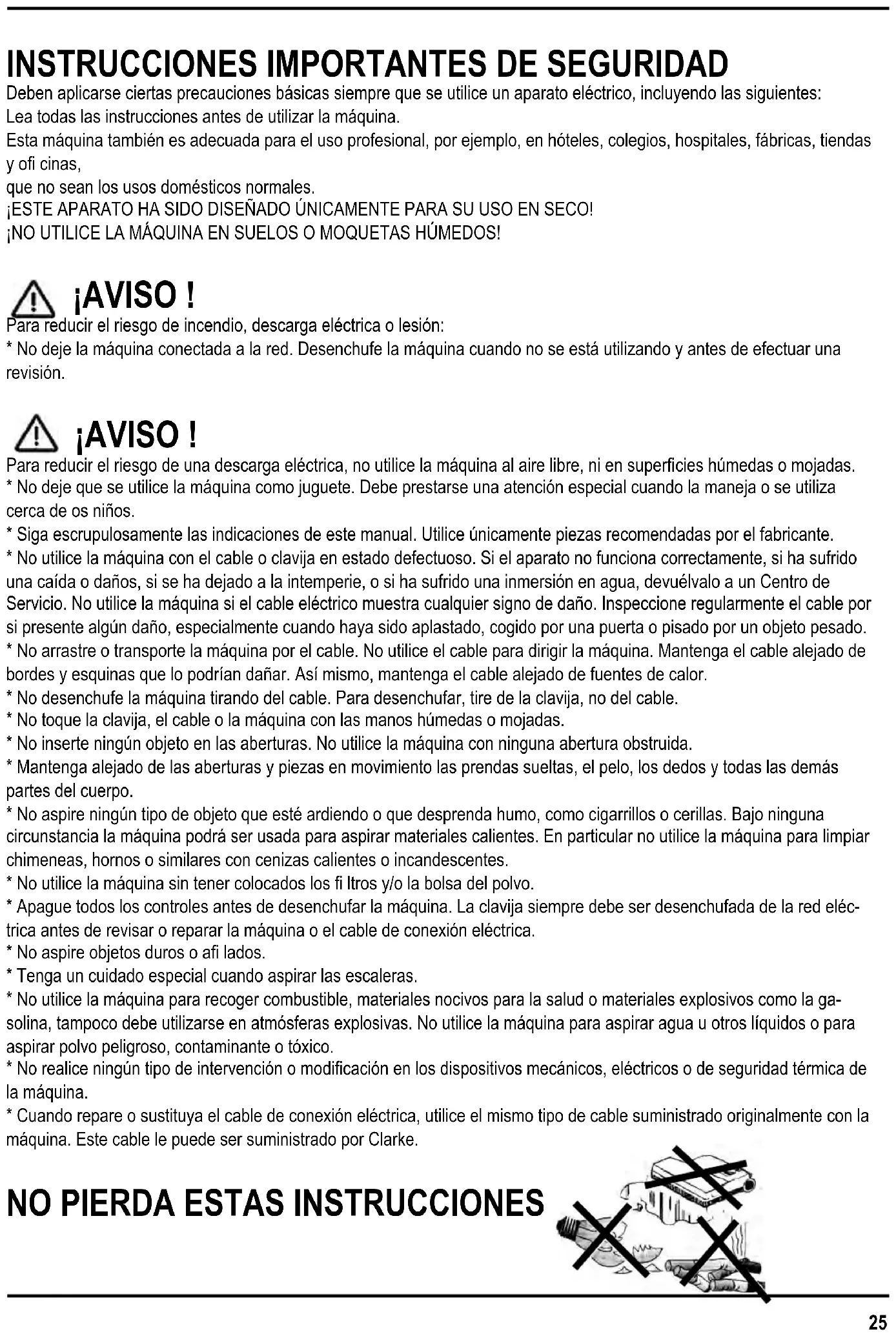 Deben aplicarse ciertas precauciones básicas siempre que se utilice un aparato eléctrico, incluyendo las siguientes: Lea todas las instrucciones antes de utilizar la máquina. Esta máquina también es adecuada para el uso profesional, por ejemplo, en hóteles, colegios, hospitales, fábricas, tiendas y ofi cinas, que no sean los usos domésticos normales. ¡ESTE APARATO HA SIDO DISEÑADO ÚNICAMENTE PARA SU USO EN SECO! ¡NO UTILICE LA MÁQUINA EN SUELOS O MOQUETAS HÚMEDOS! ¡AVISO ! Para reducir el riesgo de incendio, descarga eléctrica o lesión: