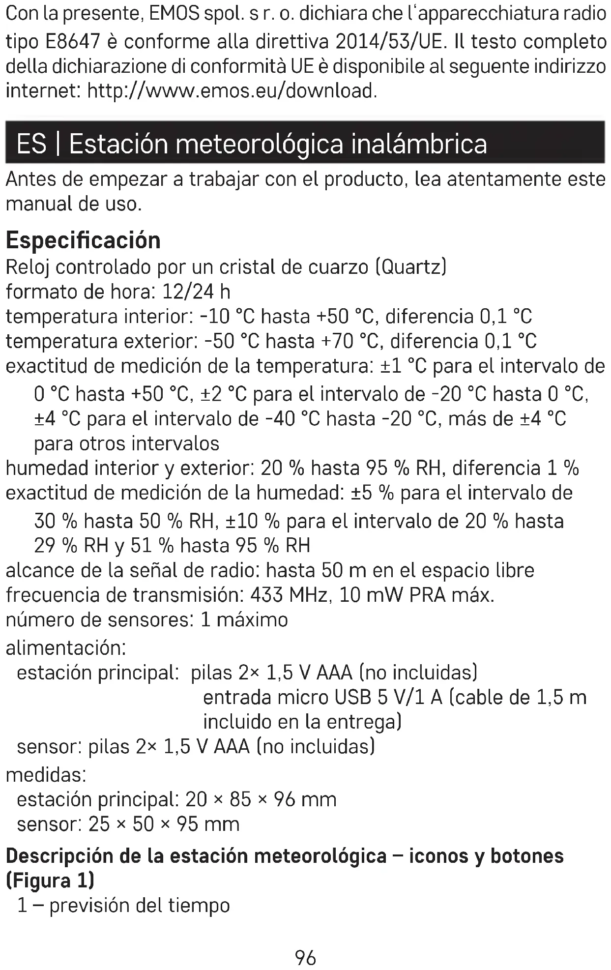 - Questo apparecchio non è destinato all’uso da parte di persone (compresi i bambini) le cui incapacità siche, sensoriali o mentali o la cui mancanza di esperienza o di conoscenze impediscono loro di utilizzare l’apparecchio in modo sicuro, a meno che non siano sorvegliate o istruite sull’uso di questo apparecchio da una persona responsabile della loro sicurezza. Non smaltire con i riuti domestici. Utilizza punti di raccolta speciali per i riuti dierenziati. Contatta le autorit à locali per informazioni sui punti di raccolta. Se i dispositivi elettronici dovessero essere smaltiti in discarica, le sostanze pericolose po- trebbero raggiungere le acque sotterranee e, di conseguenza, la catena alimentare, dove potrebbe inuire sulla salute umana.96 Con la presente, EMOS spol. s r. o. dichiara che l‘apparecchiatura radio tipo E8647 è conforme alla direttiva 2014/53/UE. Il testo completo della dichiarazione di conformità UE è disponibile al seguente indirizzo internet: http://www.emos.eu/download. ES | Estación meteorológica inalámbrica Antes de empezar a trabajar con el producto, lea atentamente este manual de uso. Especicación Reloj controlado por un cristal de cuarzo (Quartz) formato de hora: 12/24 h temperatura interior: -10°C hasta +50°C, diferencia 0,1°C temperatura exterior: -50°C hasta +70°C, diferencia 0,1°C exactitud de medición de la temperatura: ±1°C para el intervalo de 0°C hasta +50°C, ±2°C para el intervalo de -20°C hasta 0°C, ±4°C para el intervalo de -40°C hasta -20°C, más de ±4°C para otros intervalos humedad interior y exterior: 20% hasta 95% RH, diferencia 1% exactitud de medición de la humedad: ±5% para el intervalo de 30% hasta 50% RH, ±10% para el intervalo de 20% hasta 29% RH y 51% hasta 95% RH alcance de la señal de radio: hasta 50 m en el espacio libre frecuencia de transmisión: 433 MHz, 10 mW PRA máx. número de sensores: 1 máximo alimentación: estación principal: pilas 2× 1,5 V AAA (no incluidas) entrada micro USB 5 V/1 A (cable de 1,5 m incluido en la entrega) sensor: pilas 2× 1,5 V AAA (no incluidas) medidas: estación principal: 20 × 85 × 96 mm sensor: 25 × 50 × 95 mm Descripción de la estación meteorológica – iconos y botones (Figura 1) 1 – previsión del tiempo97 2 – hora 3 – alarma 4 – comunicación inalámbrica con el sensor 5 – temperatura y humedad exterior 6 – batería del sensor agotada 7 – temperatura y humedad interior 8 – batería de la estación agotada 9 – botón SNZ/LIGHT 10 – agujero para colgar 11 – botón echa abajo 12 – botón echa arriba 13 – botón ajustes 14 – espacio para pilas 15 – entrada micro USB Descripción del sensor (Figura 2) 16 – diodo LED 17 – agujero para colgar 18 – espacio para pilas 19 – botón RESET Advertencia Utilice solo pilas alcalinas de 1,5 V del mismo tipo, no utilice pilas recargables de 1,2 V. Una tensión más baja puede causar que las dos unidades no funcionen. Puesta en marcha
