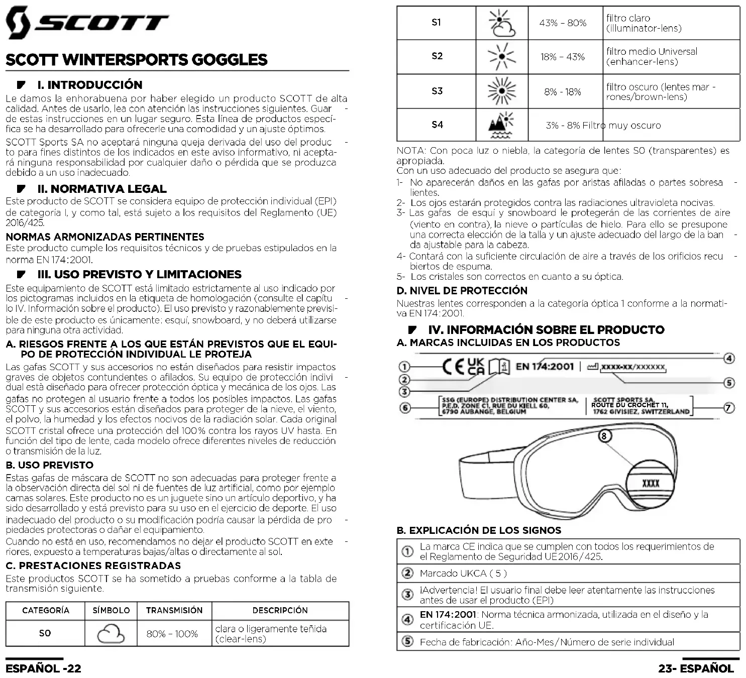 lo IV. Información sobre el producto). El uso previsto y razonablemente previsi- ble de este producto es únicamente : esquí, snowboard, y no deberá utilizarse para ninguna otra actividad. A. RIESGOS FRENTE A LOS QUE ESTÁN PREVISTOS QUE EL EQUI- PO DE PROTECCIÓN INDIVIDUAL LE PROTEJA Las gafas SCOTT y sus accesorios no están diseñados para resistir impactos graves de objetos contundentes o afilados. Su equipo de protección indivi