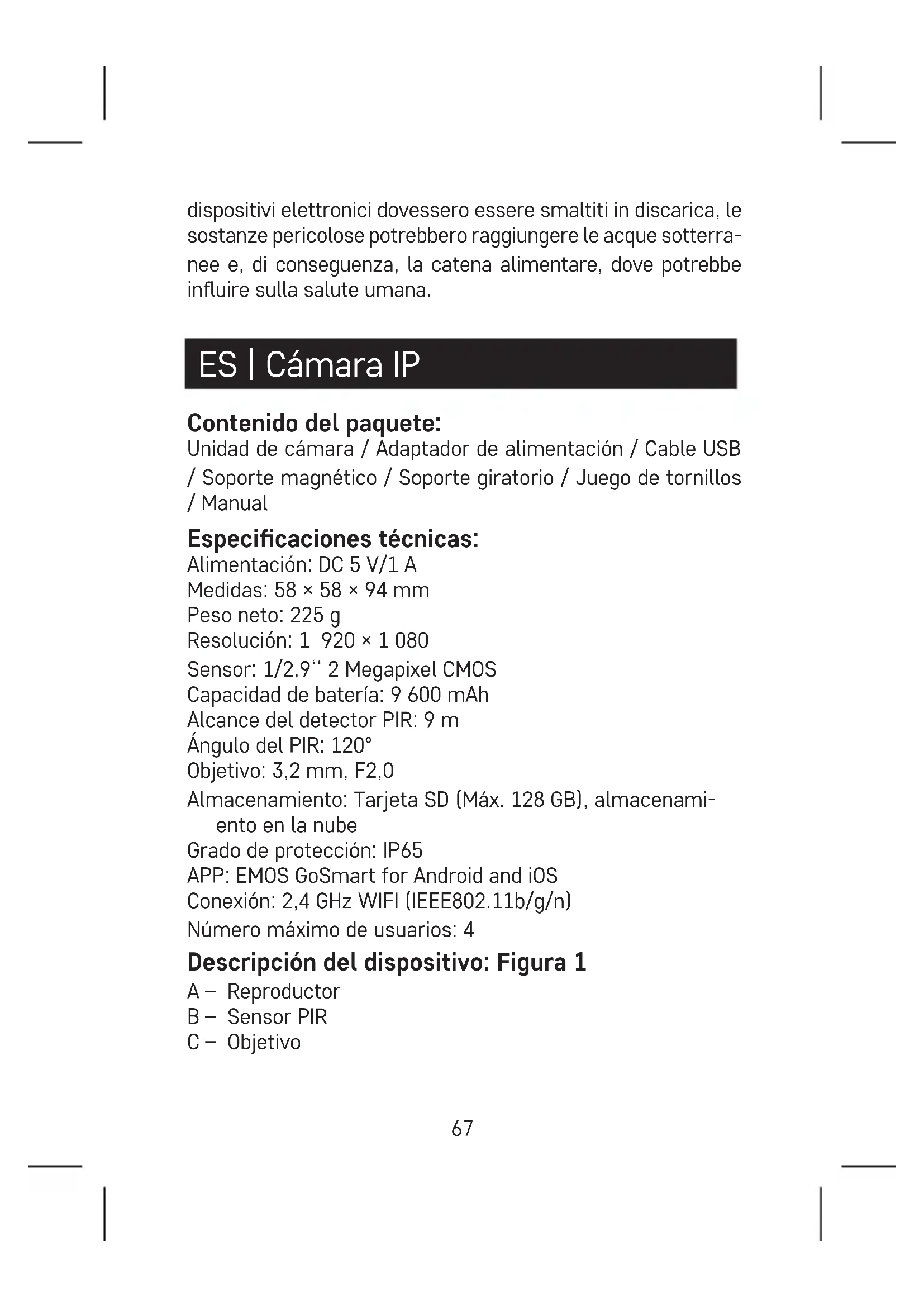 mediante un tornillo.69 Instalación de la aplicación EMOS GoSmart: Figura 3 La aplicación está disponible para Android e iOS en Google play y App Store. Para descargar la aplicación, escanee el código QR corre- spondiente. Conguración del router: Figura 4. La cámara solo funciona con Wi 2,4 GHz (no funciona con 5 GHz). Aplicación móvil EMOS GoSmart: Figura 5a Abra la aplicación EMOS GoSmart, conrme las bases de protección de datos y haga clic en «Estoy de acuerdo». Figura 5b Seleccione la opción de registro. Figura 5c Introduzca una dirección de correo electrónico válida y cree una contraseña. Conrme que está de acuerdo con la política de protección de datos. Seleccione registro. Figura 6a Seleccione la opción de añadir un dispositivo. Figura 6b Seleccione una categoría de productos. Figura 6c Seleccione un tipo de producto. Figura 6d Conecte el dispositivo a la red eléctrica. Figura 6e Asegúrese de que el diodo LED del dispositivo esté parpa- deando. Conrme con el botón «Siguiente».70 Figura 6f Introduzca el nombre de la red Wi y la contraseña. Conrme con el botón «Siguiente». Figura 6g En la pantalla de su dispositivo móvil aparecerá un código QR. Coloque el código QR delante del objetivo de la unidad de cámara. Conrme que ha oído el sonido de conexión correcta. Figura 6h Se iniciará la búsqueda automática del dispositivo. Figura 6i Dispositivo encontrado. Conrme mediante el botón «Hecho». Conectividad: Wi-Fi 2,4 GHz IEEE 802.11b/g/n Zona de frecuencia: 2,400–2,4835 GHz Por la presente, EMOS spol. s r. o. declara que el equipo de radio tipo H4053 cumple con la Directiva 2014/53/EU. El texto completo de la declaración de conformidad de la UE está disponible en la siguiente dirección de Internet: http://www. emos.eu/download. No las elimine con la basura doméstica. Utilice puntos de recolección especiales para los residuos clasica- dos. Póngase en contacto con las autoridades locales para obtener información sobre los puntos de recogida. Si los dispositivos electrónicos se eliminan en un ver- tedero, las sustancias peligrosas pueden llegar a las aguas subterráneas y, por consiguiente, a los alimentos en la cade- na, donde podría afectar a la salud humana.71 NL | IP-camera Inhoud van de verpakking: Camera-eenheid / Voedingsadapter / USB-kabel / Magne- tische houder / Draaibare houder / Schroevenset / Gebrui- kershandleiding Technische specicatie: Voeding: DC 5 V/1 A Afmetingen: 58 × 58 × 94 mm Netto gewicht: 225 g Resolutie: 1 920 × 1 080 Sensor: 1/2,9‘‘ 2 Megapixel CMOS Batterijcapaciteit: 9 600 mAh Detectiebereik PIR: 9 m PIR-hoek: 120° Objectief: 3,2 mm, F2,0 Opslagplaats: SD card (max. 128 GB), Cloud storage Dekkingsgraad: IP65 APP: EMOS GoSmart for Android and iOS Aansluiting: 2,4 GHz WIFI (IEEE802.11b/g/n) Maximaal aantal gebruikers: 4 Omschrijving van de installatie: Afb. 1 A – Luidspreker B – PIR-sensor C – Lens D – Status-LED De diode brandt rood: netwerkinstelling niet in orde. Diode knippert rood: De camera bereidt zich voor om verbinding te maken met het Wi-netwerk. De LED knippert snel rood: Wi-netwerkverbinding is72 bezig. LED brandt blauw: de camera werkt naar behoren. E – toets RESET Druk gedurende 5 s op de toets RESET om het apparaat terug te zetten naar de fabrieksinstellingen. F – Lichtsensor G – Micro USB-ingang H – Oplaadindicator De diode brandt rood: batterij wordt opgeladen. LED brandt blauw: het opladen is voltooid. I – Microfoon J – SD-kaartsleuf (max. 128 GB) Installatie van de magnetische houder: Afb. 2a