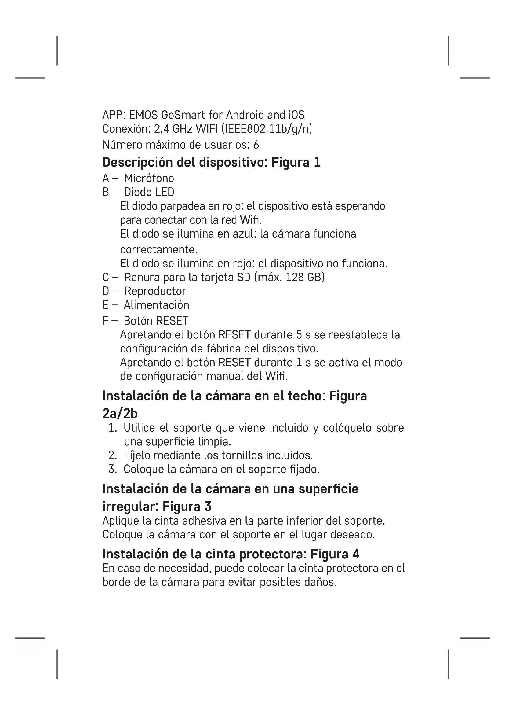 Instalación de la cámara en una supercie irregular: Figura 3 Aplique la cinta adhesiva en la parte inferior del soporte. Coloque la cámara con el soporte en el lugar deseado. Instalación de la cinta protectora: Figura 4 En caso de necesidad, puede colocar la cinta protectora en el borde de la cámara para evitar posibles daños.Instalación de la aplicación EMOS GoSmart: Figura 5 La aplicación está disponible para Android e iOS en Google play y App Store. Para descargar la aplicación, escanee el código QR corre- spondiente. Conguración del router: Figura 6. La cámara solo funciona con Wi 2,4 GHz (no funciona con 5 GHz). Aplicación móvil EMOS GoSmart: Figura 5a Abra la aplicación EMOS GoSmart, conrme las bases de protección de datos y haga clic en «Estoy de acuerdo». Figura 5b Seleccione la opción de registro. Figura 5c Introduzca una dirección de correo electrónico válida y cree una contraseña. Conrme que está de acuerdo con la política de protección de datos. Seleccione registro. Figura 6a Seleccione la opción de añadir un dispositivo. Figura 6b Seleccione una categoría de productos. Figura 6c Seleccione un tipo de producto. Figura 6d Conecte el dispositivo a la red eléctrica. Figura 6e Asegúrese de que el diodo LED del dispositivo esté parpa- deando. Conrme con el botón «Siguiente».Figura 6f Introduzca el nombre de la red Wi y la contraseña. Conrme con el botón «Siguiente». Figura 6g En la pantalla de su dispositivo móvil aparecerá un código QR. Coloque el código QR delante del objetivo de la unidad de cámara. Conrme que ha oído el sonido de conexión correcta. Figura 6h Se iniciará la búsqueda automática del dispositivo. Figura 6i Dispositivo encontrado. Conrme mediante el botón «Hecho». Conectividad: Wi-Fi 2,4 GHz IEEE 802.11b/g/n Zona de frecuencia: 2,400–2,4835 GHz Por la presente, EMOS spol. s r. o. declara que el equipo de radio tipo H4051 cumple con la Directiva 2014/53/EU. El texto completo de la declaración de conformidad de la UE está disponible en la siguiente dirección de Internet: http://www. emos.eu/download. No las elimine con la basura doméstica. Utilice puntos de recolección especiales para los residuos clasica- dos. Póngase en contacto con las autoridades locales para obtener información sobre los puntos de recogida. Si los dispositivos electrónicos se eliminan en un ver- tedero, las sustancias peligrosas pueden llegar a las aguas subterráneas y, por consiguiente, a los alimentos en la cade- na, donde podría afectar a la salud humana.NL | IP-camera Inhoud van de verpakking: Camera / Voedingsadapter / USB-kabel / Houder / Plakband / Schroeven / Beschermende tape / Gebruikershandleiding Technische specicatie: Voeding: DC 5 V/1 A Afmetingen: 57 × 57 × 71 mm Netto gewicht: 180 g Resolutie: 1 920 × 1 080 Sensor: 1/2,9‘‘ 2 Megapixel CMOS IR-afstand: Nachtzicht tot 10 m Objectief: 3,6 mm, F2,0 Opslagplaats: SD card (max. 128 GB), Cloud storage, NVR APP: EMOS GoSmart for Android and iOS Aansluiting: 2,4 GHz WIFI (IEEE802.11b/g/n) Maximaal aantal gebruikers: 6 Omschrijving van de installatie: afb. 1 A – Microfoon B – Status-LED Diode knippert rood: Het apparaat wacht om verbinding te maken met het Wi-netwerk. LED brandt blauw: de camera werkt naar behoren. De diode brandt rood: apparaat werkt niet. C – SD-kaartsleuf (max. 128 GB) D – Luidspreker E – Stroomvoorziening F – toets RESET Druk gedurende 5 s op de toets RESET om het apparaat terug te zetten naar de fabrieksinstellingen.Druk gedurende 1 s op de toets RESET om de manuele instelmodus van de Wi te activeren. Installeer de camera aan het plafond: afb. 2a/2b