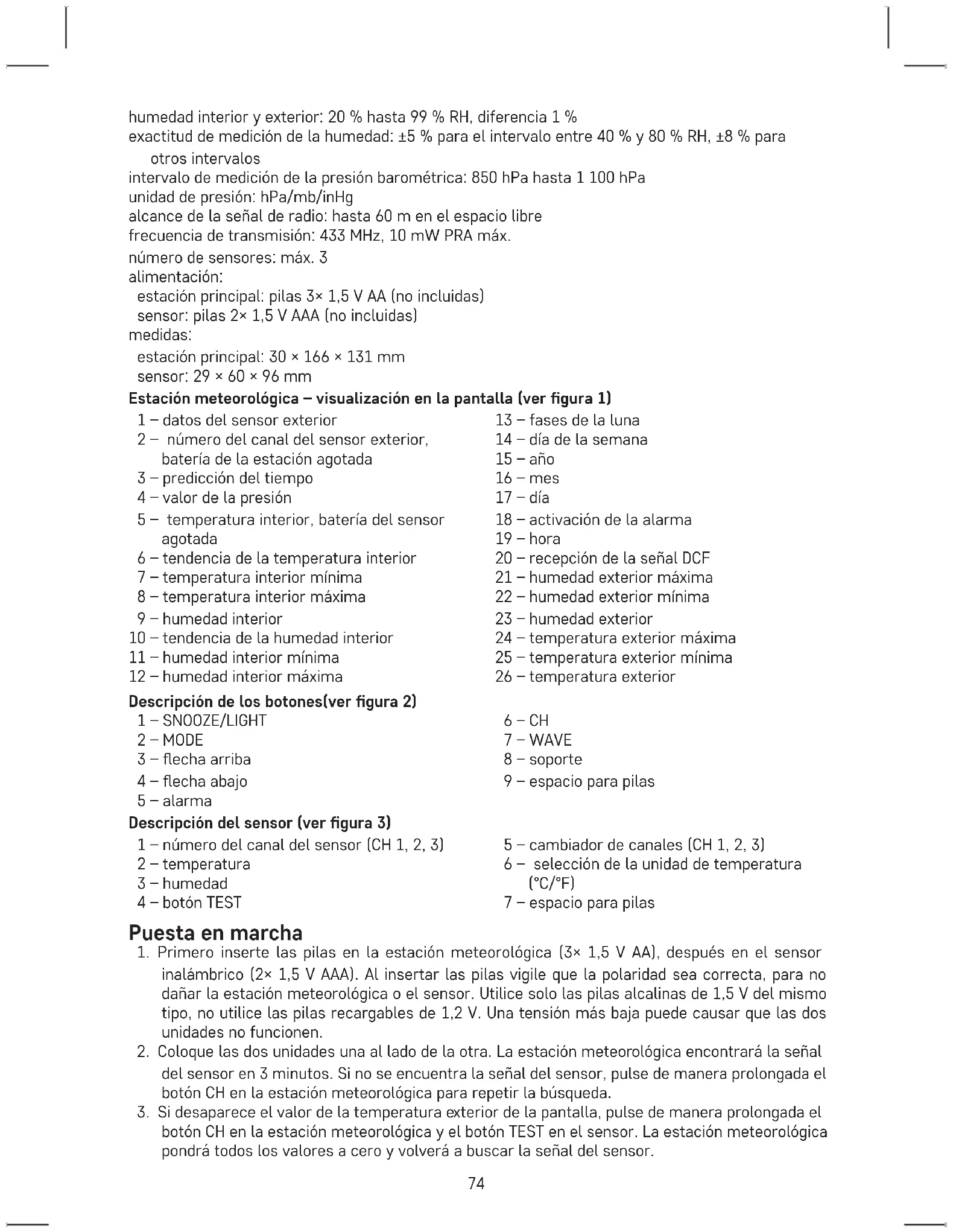 – formato de la fecha – mes – día – idioma del calendario – zona horaria. Pulsando el botón MODE puede cambiar entre los diferentes valores y puede ajustarlos usando los botones de echa arriba y abajo . Los idiomas del calendario son los siguientes: (ENG – inglés, FR – francés, IT – italiano, ES – español, NE – holandés, DA – danés, GE – alemán) Ajuste del formato de la hora 12/24 h, y de la unidad de temperatura °C/°F Pulsando repetidamente el botón MODE puede ajustar el formato de la hora en 12/24 h. Pulsando repetidamente el botón ajustará la unidad de la temperatura °C/°F. Presión atmosférica – historial El valor de la presión se muestra en el campo número 4. Debajo de este valor se muestra el gráco del historial de la presión en las últimas 12 horas máximo. Pulsando prolongadamente el botón repetidas veces puede ajustar la unidad de la presión inHg o hPa/mb. Trasladar la estación meteorológica a otro sitio inuirá en los valores medidos. Las mediciones se estabilizan durante las 12 horas siguientes tras haber insertado las pilas o trasladado la estación. La tendencia de las temperaturas y humedad indicador de la tendencia de temperatura y humedad ascendiente estable descendiente Fases de la luna (ver gura 4) Las fases de la luna se muestran en el campo número 13. 1 – Luna llena 2 – Luna gibosa menguante 3 – Cuarto menguante 4 – Luna menguante 5 – Luna nueva 6 – Luna creciente 7 – Cuarto creciente 8 – Luna gibosa creciente Visualización de los valores medidos mínimos y máximos de la temperatura y la humedad Los valores medidos de la temperatura exterior se muestran en el campo número 24 y 25, de la temperatura interior en el campo número 7 y 8. Los valores medidos de la humedad exterior se muestran en el campo número 21 y 22, de la humedad interior en el campo número 11 y 12. La memoria se borra automáticamente cada día a las 00:00. Para borrar la memoria de los valores medidos de manera manual pulse prolongadamente el botón . Ajuste de la alarma Pulse de manera prolongada el botón , el ajuste de hora empieza a parpadear. Con los botones y ajuste la hora deseada de la alarma. Para conrmar el ajuste o desplazarse en el menú pulse el botón .77 Para activar la alarma pulse brevemente el botón , se mostrará el icono . Volviendo a pulsar el botón desactivará la alarma, el icono desaparecerá. Función de la alarma repetida (snooze) Pulsando el botón SNOOZE/LIGHT ubicado en la parte superior de la estación meteorológica aplazará la alarma 5 minutos. Pulse este botón en cuanto empiece a sonar la alarma. El icono parpadeará. Para cancelar la función SNOOZE pulse cualquier otro botón – el icono dejará de parpadear y quedará visible . La alarma se volverá a activar al día siguiente. Breve retroiluminación de la pantalla de la estación Al pulsar el botón SNOOZE/LIGHT la pantalla se ilumina 5 segundos y luego se apaga. Predicción del tiempo La estación predice el tiempo para las próximas 12–24 horas y una distancia de 15–20 km a su alrededor basándose en el cambio de la presión atmosférica. La precisión de la predicción del tiempo es de 70–75 %. El icono de la predicción del tiempo se muestra en el campo número 3. Porque la predicción no siempre es segura al 100 %, ni el fabricante ni el proveedor pueden ser responsables de cualquier daño causado por una predicción del tiempo imprecisa. Tras el primer ajuste o al reiniciar la estación meteorológica tarda aproximadamente 12 horas hasta que la estación empiece a predecir correctamente. Iconos de la predicción del tiempo (ver gura 5) 1 – Despejado 2 – Intervalos nubosos 3 – Cielo cubierto 4 – Lluvia 5 – Nieve Aviso de cambio de pilas Cuando se muestra en la pantalla de la estación o del sensor el icono de la batería agotada , cambie las pilas en la estación o en el sensor. Cuidado y mantenimiento El producto está diseñado para que su vida útil sea larga y able si se utiliza de una manera adecuada. Aquí hay algunos consejos para su manipulación correcta: