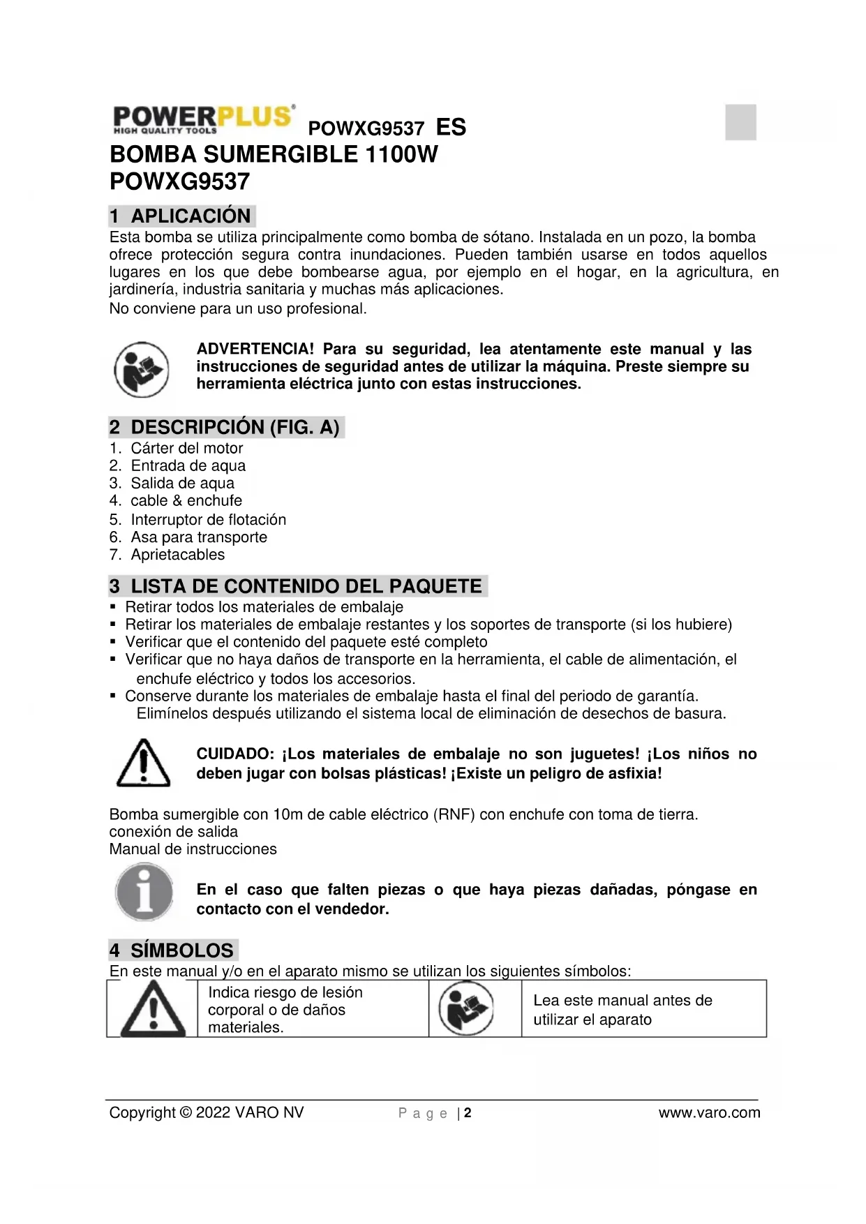 - Al ajusfar el interruptor de flotador compruebe que éste no toque el suelo antes de que se pare la bomba, de lo contrario existe peligro de que ésta funcione en seco. Este aparato no puede ser utilizado por niños o personas debilitadas física o mentalmente, o afectadas desde el punto de vista de su desarrollo, ni por personas que carezcan de experiencia o conocimientos, excepto en caso de que recibieren una formación de parte de una persona responsable de su seguridad, un supervisor, o que estudiaren las anteriores instrucciones relativas al uso de este aparato.POWXG9537 ES Copyright © 2022 VARO NV P a g e | 5 www.varo.com
