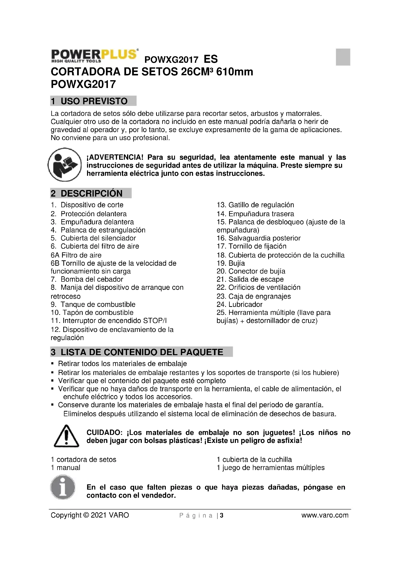 VARO – Vic. Van Rompuy N.V. – Joseph Van Instraat 9. BE2500 Lier – Bélgica, declara que: Tipo de aparato: Cortadora de setos 26 cm³ Marca: POWERplus Número del producto: POWXG2017 está en conformidad con los requisitos esenciales y otras disposiciones pertinentes de las Directivas europeas aplicables, basados en la aplicación de las normas europeas armonizadas. Cualquier modificación no autorizada de este aparato anula esta declaración. Directivas europeas (incluyendo, si se aplica, sus respectivas enmiendas hasta la fecha de la firma): 2006/42/EC 2014/30/EU 2000/14/EC Annex V LwA Measured 106dB(A) Guaranteed 108dB(A) Normas europeas armonizadas (incluyendo, si se aplica, sus respectivas hasta la fecha de la firma): EN ISO 10517 : 2019 Custodio de la documentación técnica: Philippe Vankerkhove, VARO – Vic. Van Rompuy N.V. El suscrito actúa en nombre del director general de la compañía, Philippe Vankerkhove Asuntos reglamentarios - Director de conformidad 11/09/20POWXG2017 IT Copyright © 2021 VARO Pag. | 1 www.varo.com 1 USO PREVISTO ................................................................................. 3 2 DESCRIZIONE ................................................................................... 3