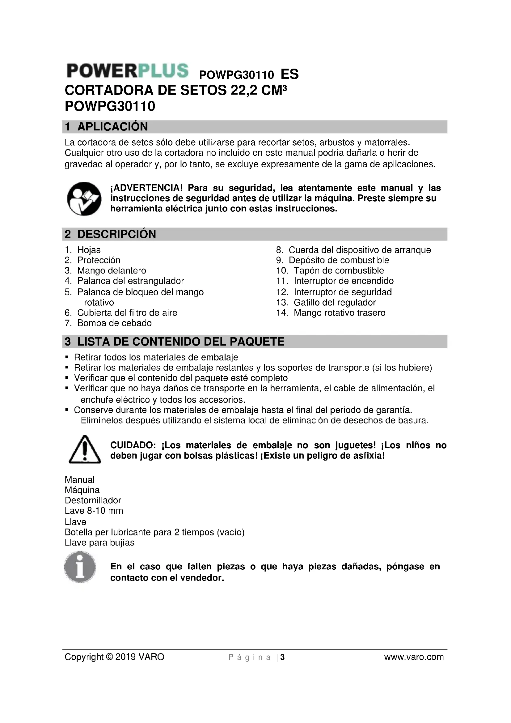 - Conserve durante los materiales de embalaje hasta el final del periodo de garantía. Elimínelos después utilizando el sistema local de eliminación de desechos de basura. CUIDADO: ¡Los materiales de embalaje no son juguetes! ¡Los niños no deben jugar con bolsas plásticas! ¡Existe un peligro de asfixia! Manual Máquina Destornillador Lave 8-10 mm Llave Botella per lubricante para 2 tiempos (vacío) Llave para bujías En el caso que falten piezas o que haya piezas dañadas, póngase en contacto con el vendedor.POWPG30110 ES Copyright © 2019 VARO P á g i n a | 4 www.varo.com 4 SÍMBOLOS En este manual y/o en el aparato mismo se utilizan los siguientes símbolos: