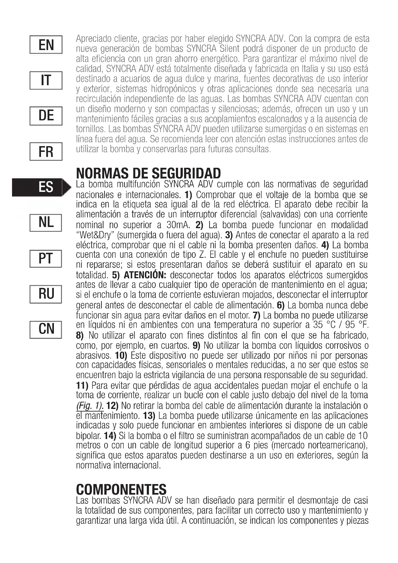 CNApreciado cliente, gracias por haber elegido SYNCRA ADV. Con la compra de esta nueva generación de bombas SYNCRA Silent podrá disponer de un producto de alta eficiencia con un gran ahorro energético. Para garantizar el máximo nivel de calidad, SYNCRA ADV está totalmente diseñada y fabricada en Italia y su uso está destinado a acuarios de agua dulce y marina, fuentes decorativas de uso interior y exterior, sistemas hidropónicos y otras aplicaciones donde sea necesaria una recirculación independiente de las aguas. Las bombas SYNCRA ADV cuentan con un diseño moderno y son compactas y silenciosas; además, ofrecen un uso y un mantenimiento fáciles gracias a sus acoplamientos escalonados y a la ausencia de tornillos. Las bombas SYNCRA ADV pueden utilizarse sumergidas o en sistemas en línea fuera del agua. Se recomienda leer con atención estas instrucciones antes de utilizar la bomba y conservarlas para futuras consultas.