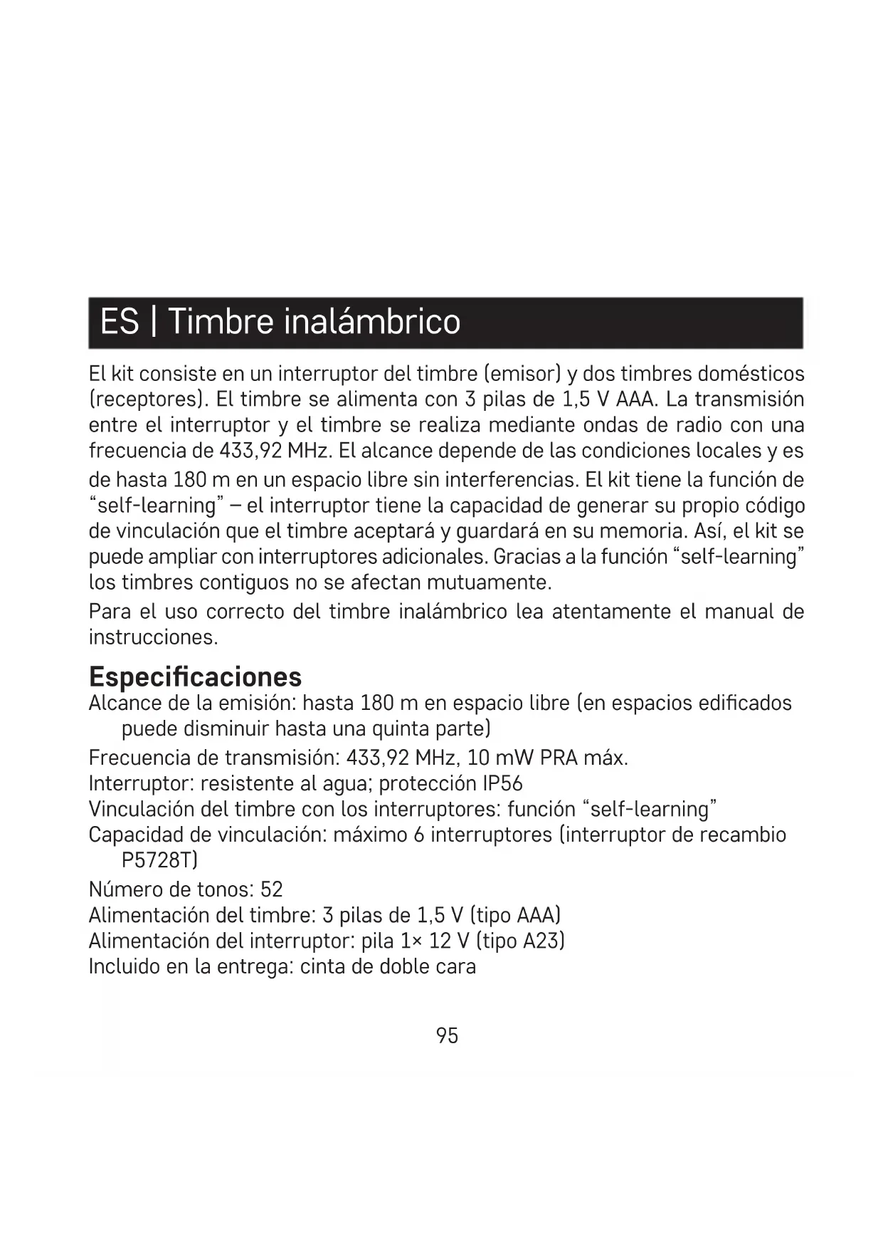 - El timbre (receptor) está diseñado solo para el uso interior en espacios secos.