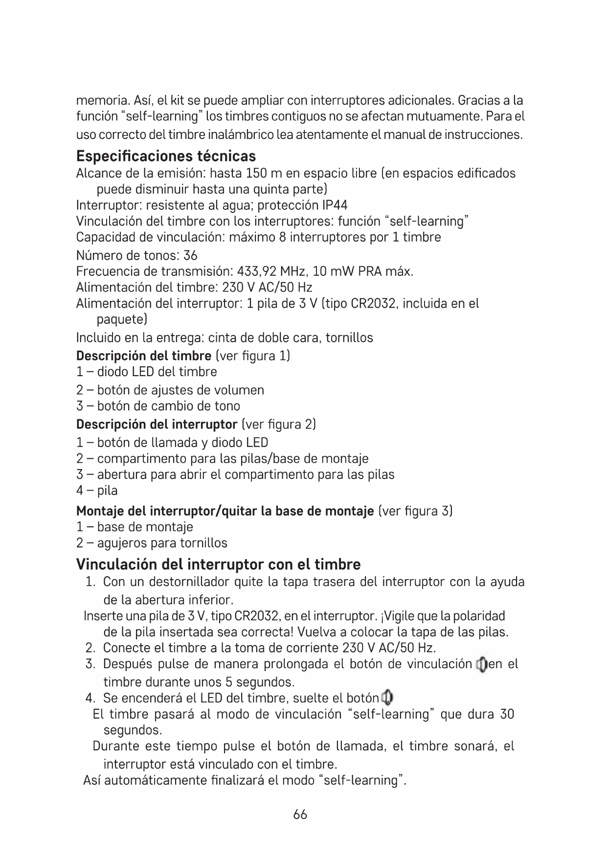 El timbre pasará al modo de vinculación “self-learning” que dura 30 segundos. Durante este tiempo pulse el botón de llamada, el timbre sonará, el interruptor está vinculado con el timbre. Así automáticamente nalizará el modo “self-learning”.67