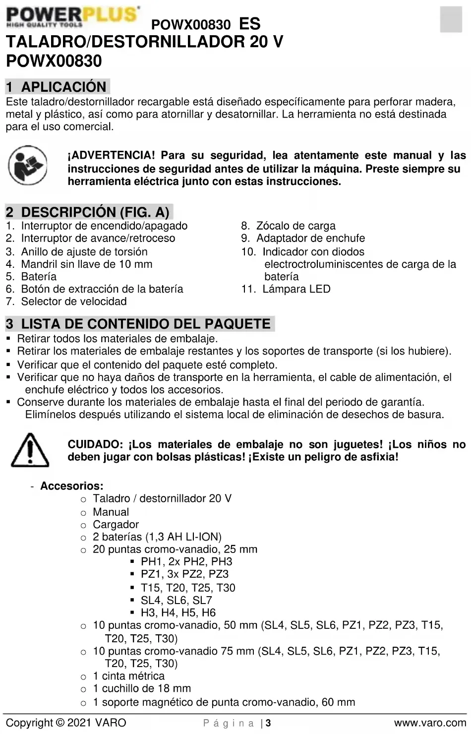 - Antes de utilizar el cargador y el paquete de batería, lea atentamente el manual de instrucciones.POWX00830 ES Copyright © 2021 VARO P á g i n a | 7 www.varo.com