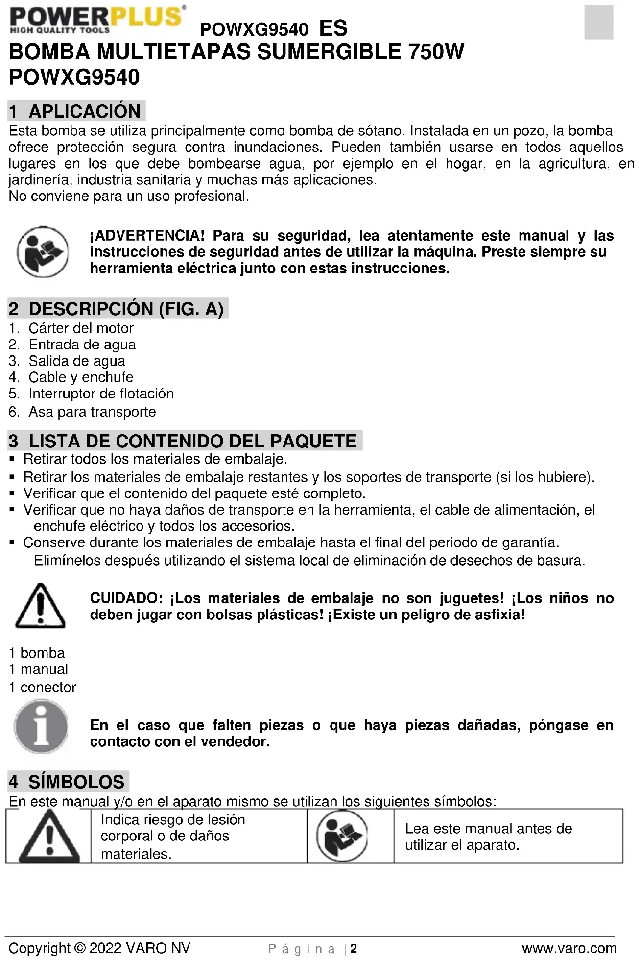 - un conducto flexible. Se fijar con la manija prevista para tal efecto o colocar en el fondo del sumidero (éste debe estar limpio, sin impurezas ni lodos) Si el nivel del agua es bajo (largo periodo de sequía), asegúrese de que las impurezas o lodos, una vez secos, no impidan el arranque de la bomba. Por lo tanto, es necesario asegurarse de que el sitio en que se instala la bomba esté limpio y hacer funcionar la bomba de vez en cuando.POWXG9540 ES Copyright © 2022 VARO NV P á g i n a | 4 www.varo.com Se debe usar siempre la bomba en posición vertical (con la manija arriba). Se recomienda asegurar la bomba atándola con una cuerda (o un dispositivo similar) a la manija y, en el otro extremo, a un objeto estático fácilmente accesible.
