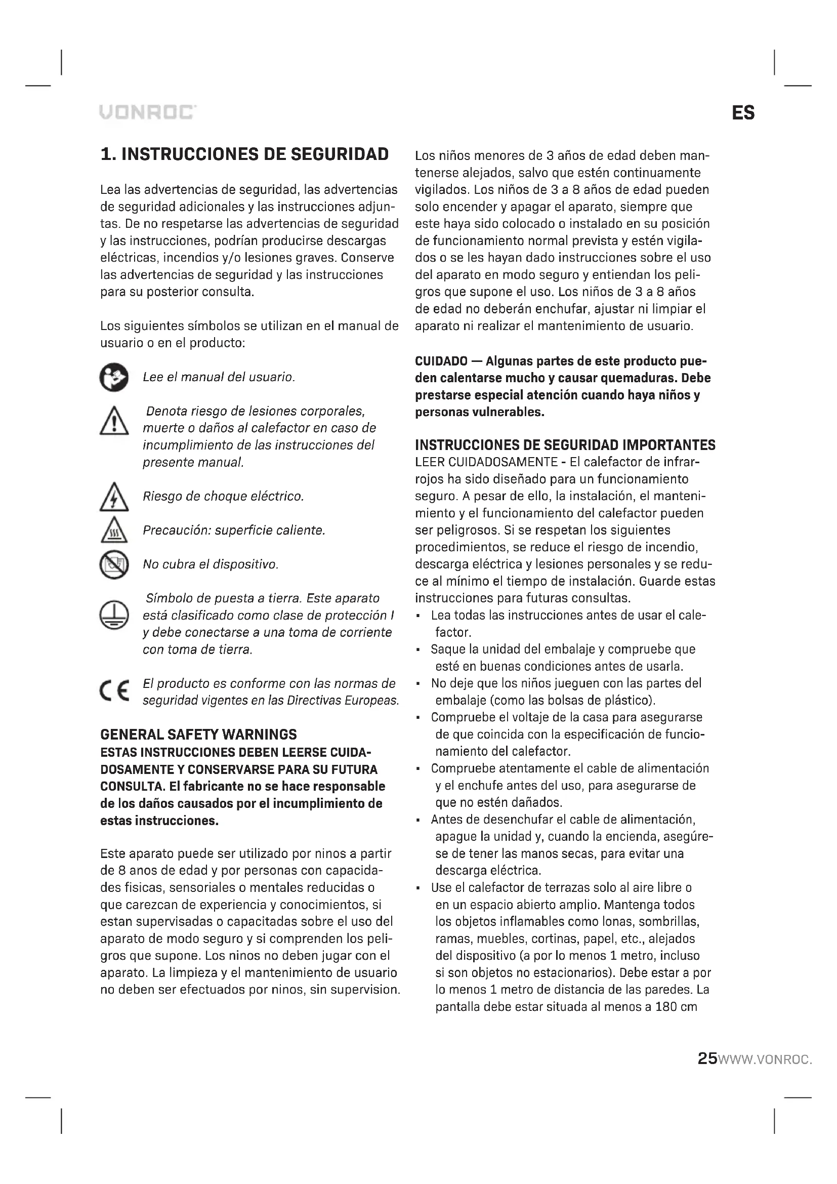 Lea las advertencias de seguridad, las advertencias de seguridad adicionales y las instrucciones adjun- tas. De no respetarse las advertencias de seguridad y las instrucciones, podrían producirse descargas eléctricas, incendios y/o lesiones graves. Conserve las advertencias de seguridad y las instrucciones para su posterior consulta. Los siguientes símbolos se utilizan en el manual de usuario o en el producto: Lee el manual del usuario. Denota riesgo de lesiones corporales, muerte o daños al calefactor en caso de incumplimiento de las instrucciones del presente manual. Riesgo de choque eléctrico. Precaución: superficie caliente. No cubra el dispositivo. Símbolo de puesta a tierra. Este aparato está clasificado como clase de protección I y debe conectarse a una toma de corriente con toma de tierra. El producto es conforme con las normas de seguridad vigentes en las Directivas Europeas.