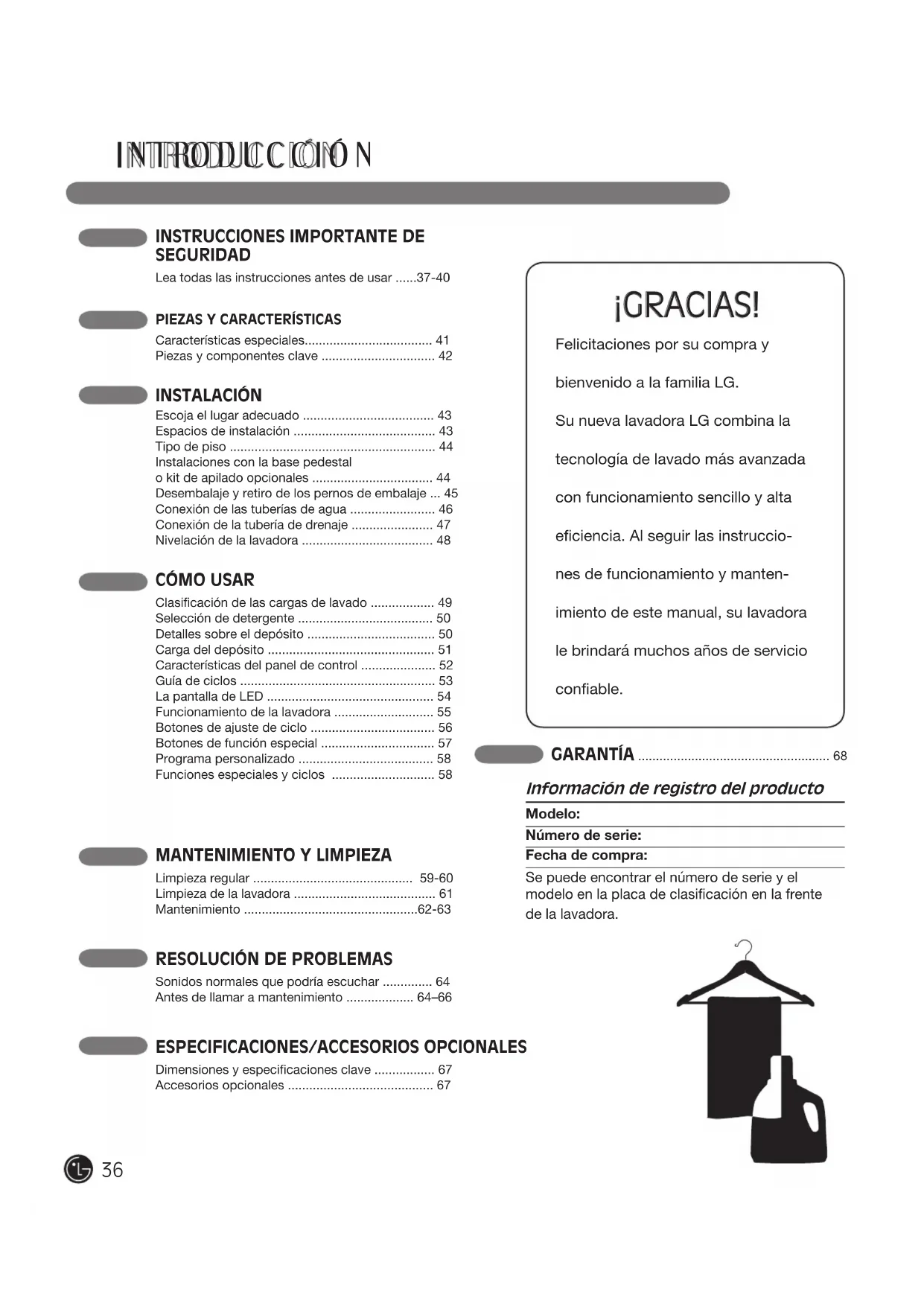 SEGURIDAD Lea todas las instrucciones antes de usar ......37-40Dimensiones y especificaciones clave ................. 67 Accesorios opcionales ......................................... 67 Felicitaciones por su compra y bienvenido a la familia LG. Su nueva lavadora LG combina la tecnología de lavado más avanzada con funcionamiento sencillo y alta eficiencia. Al seguir las instruccio- nes de funcionamiento y manten- imiento de este manual, su lavadora le brindará muchos años de servicio confiable. ¡GRACIAS! INSTALACIÓN Información de registro del producto Modelo:Número de serie:Fecha de compra:Se puede encontrar el número de serie y el modelo en la placa de clasificación en la frentede la lavadora. 36I N S T RU C C I O N E S I M P O RTA N T E D E S E G U R I DA D Su Seguridad y la de los demás son de suma importancia. En este manual y en su electrodoméstico figuran muchos mensajes importantes de seguridad. Lea y cumpla siempre con todos los mensajes de seguridad.Éste es el símbolo de alerta de seguridad.El mismo alerta sobre potenciales riesgos de muerte o heridas tanto para usted como para otras personas.Todos los mensajes de seguridad estarán a continuación del símbolo de alerta de seguridad y con la palabra PELIGRO o ADVERTENCIA. Estas palabras significan: wPELIGRO: Corre riesgo de muerte o de sufrir heridas serias si no sigue las instrucciones inmediatamente. wADVERTENCIA: Corre riesgo de muerte o de sufrir heridas serias si no sigue las instrucciones.Todos los mensajes de seguridad le indicarán cuál es el riesgo potencial, le dirán cómo reducir las posibilidades de sufrir heridas y qué puede suceder si no se siguen las instrucciones. wADVERTENCIA Por su seguridad, debe seguir la información indicada en este manual para minimizar el riesgo de incendio o explosión, descarga eléctrica, o para prevenir daños a la propiedad, lesiones personales o muerte. LEA TODAS LAS INSTRUCCIONES ANTES DE USAR 37INSTRUCCIONES BáSICAS DE SEGURIDAD wADVERTENCIA Para minimizar el riesgo de incendio o explosión, descarga eléctrica, o para prevenir lesiones personales cuando use electrodomésticos, se deben seguir precauciones básicas de seguridad, incluyendo las siguientes: I N S T RU C C I O N E S I M P O RTA N T E D E S E G U R I DA D