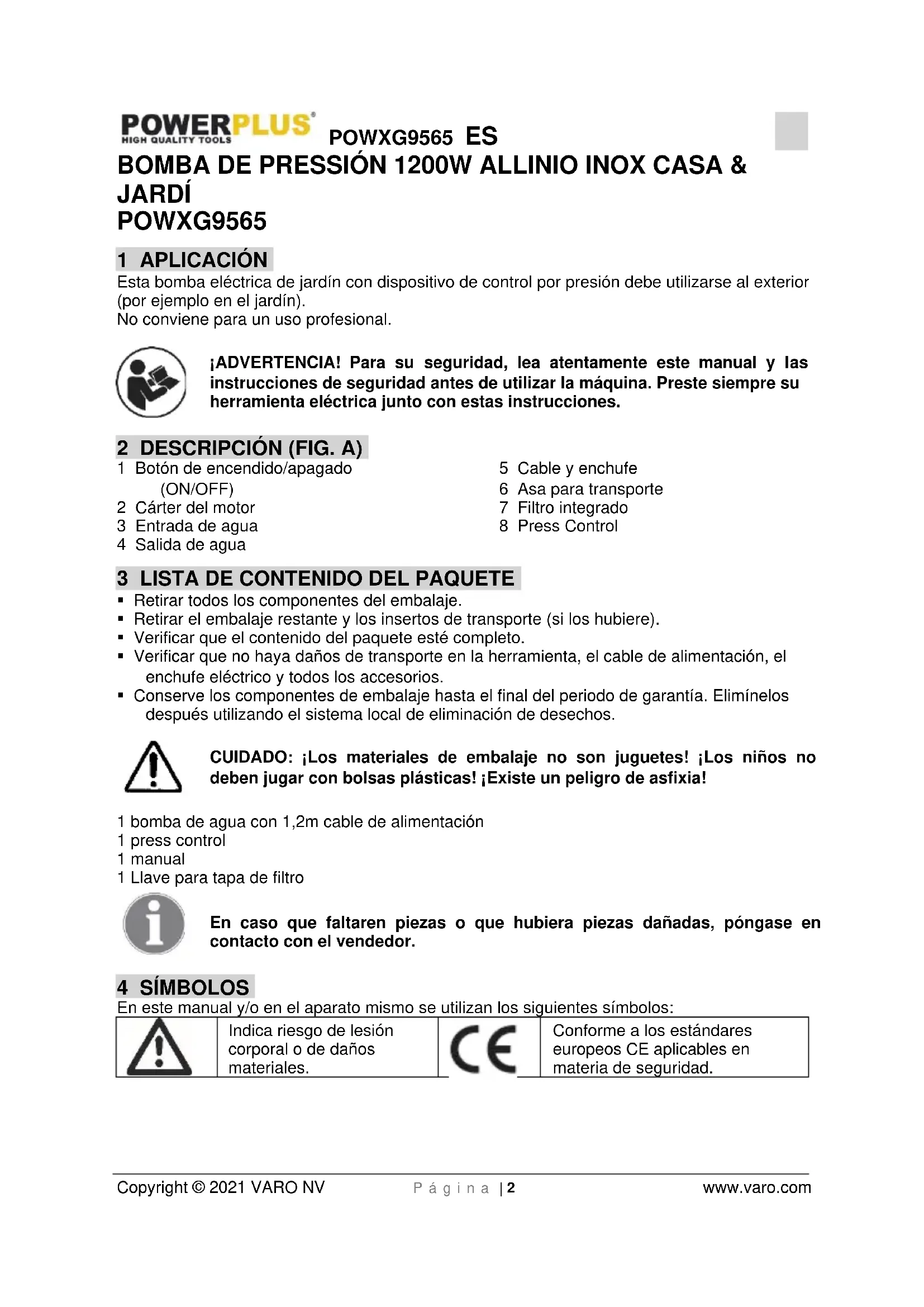 - Esta bomba de agua no es adecuada para el funcionamiento continuado, por ejemplo en empresas industriales o mineras ni para sistemas de reciclaje del agua.POWXG9565 ES Copyright © 2021 VARO NV P á g i n a | 5 www.varo.com
