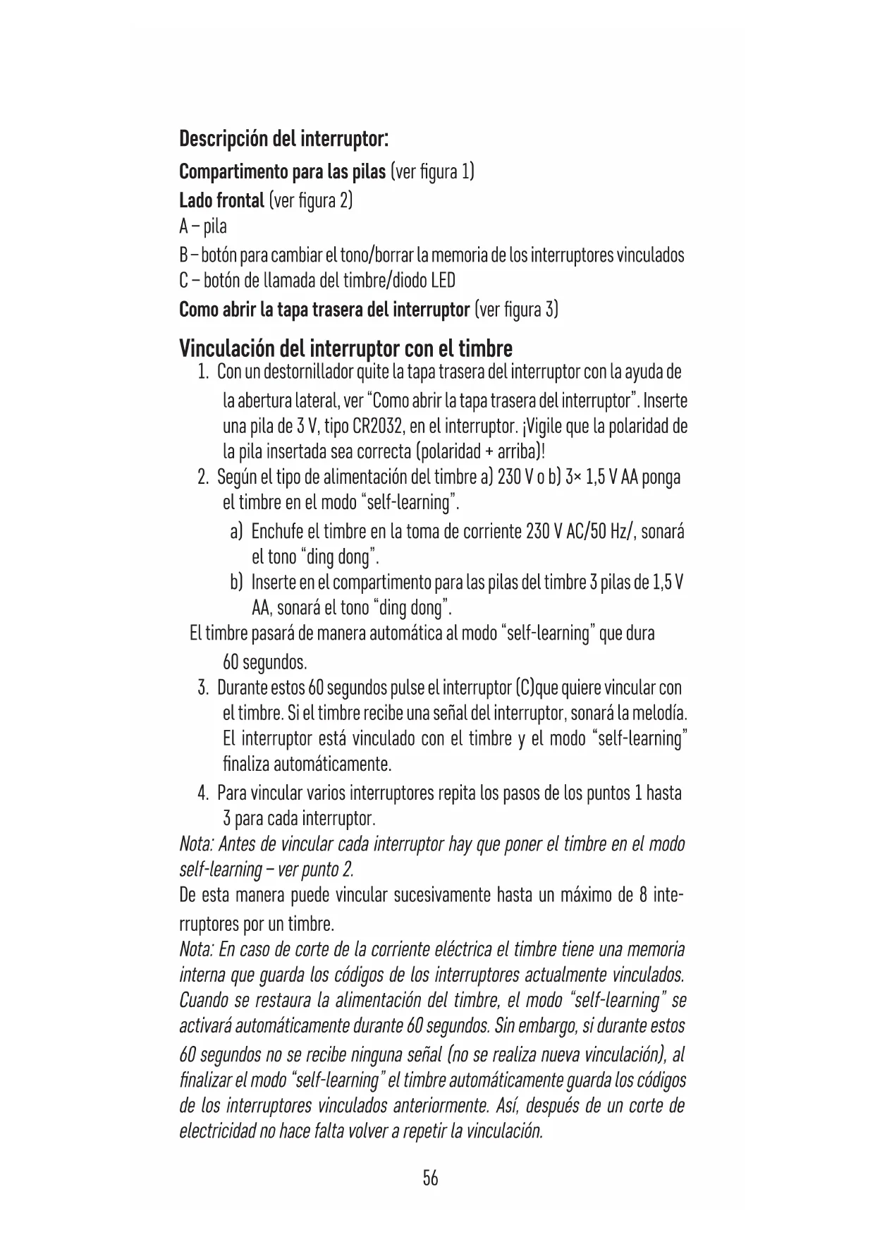 3 para cada interruptor. Nota: Antes de vincular cada interruptor hay que poner el timbre en el modo self-learning – ver punto 2. De esta manera puede vincular sucesivamente hasta un máximo de 8 inte- rruptores por un timbre. Nota: En caso de corte de la corriente eléctrica el timbre tiene una memoria interna que guarda los códigos de los interruptores actualmente vinculados. Cuando se restaura la alimentación del timbre, el modo “self-learning” se activará automáticamente durante 60 segundos. Sin embargo, si durante estos 60 segundos no se recibe ninguna señal (no se realiza nueva vinculación), al nalizar el modo “self-learning” el timbre automáticamente guarda los códigos de los interruptores vinculados anteriormente. Así, después de un corte de electricidad no hace falta volver a repetir la vinculación.57 Borrar la memoria de los interruptores vinculados