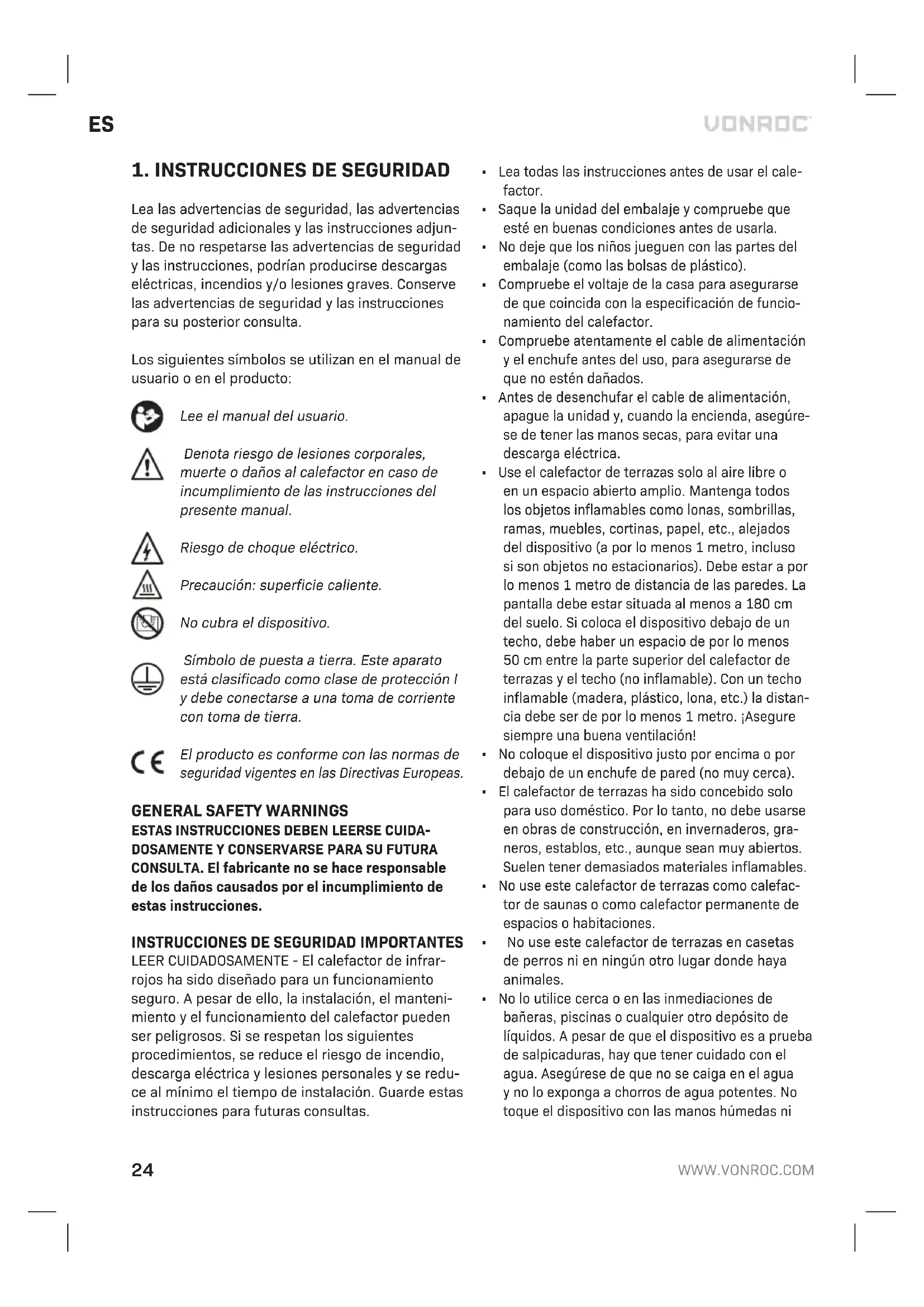 Lea las advertencias de seguridad, las advertencias de seguridad adicionales y las instrucciones adjun- tas. De no respetarse las advertencias de seguridad y las instrucciones, podrían producirse descargas eléctricas, incendios y/o lesiones graves. Conserve las advertencias de seguridad y las instrucciones para su posterior consulta. Los siguientes símbolos se utilizan en el manual de usuario o en el producto: Lee el manual del usuario. Denota riesgo de lesiones corporales, muerte o daños al calefactor en caso de incumplimiento de las instrucciones del presente manual. Riesgo de choque eléctrico. Precaución: superficie caliente. No cubra el dispositivo. Símbolo de puesta a tierra. Este aparato está clasificado como clase de protección I y debe conectarse a una toma de corriente con toma de tierra. El producto es conforme con las normas de seguridad vigentes en las Directivas Europeas.